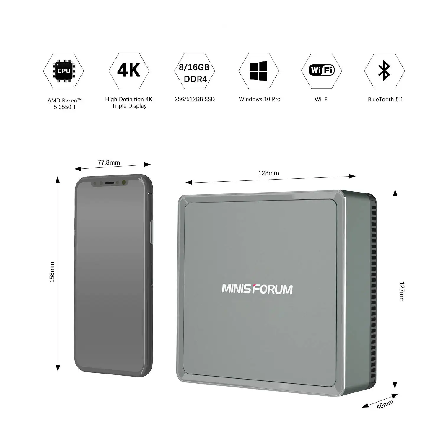 DeskMini UM350 viene con AMD Ryzen™5 3550H, que integra 4 núcleos/8 subprocesos (reloj base de 2,1 GHz y reloj de impulso máximo de hasta 3,7 GHz) y posee potentes capacidades de carga y procesamiento de tareas. Respaldado por AMD Radeon™Gráficos (1200 MHz), este mini PC puede crear una experiencia creativa y de entretenimiento más agradable.
