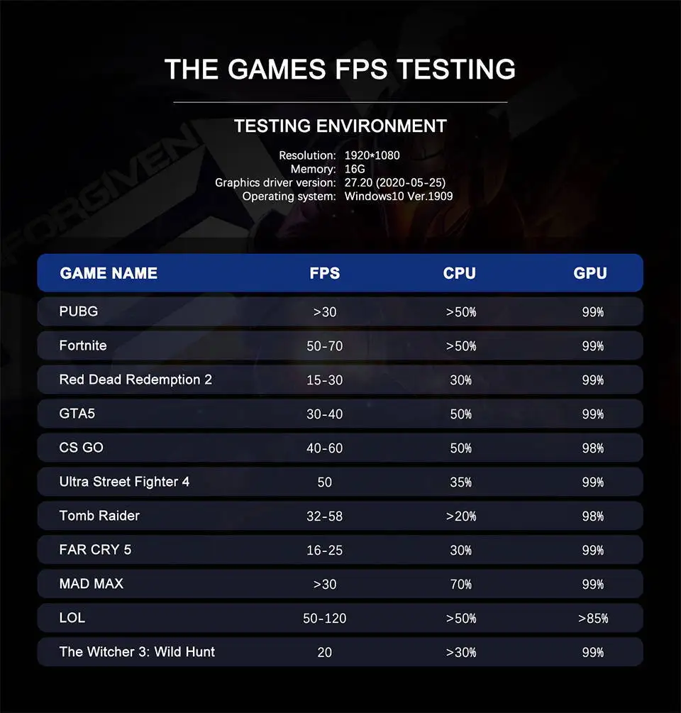 La siguiente tabla muestra los resultados de evaluación comparativa en algunos juegos (Resolución 1920 × 1080):