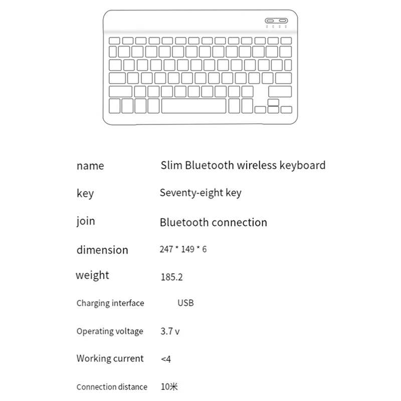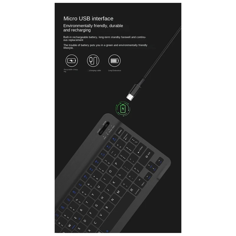 3.Modo de carga y suspensión automática: el teclado bluetooth inalámbrico universal utiliza una batería de litio incorporada, que se puede cargar fácilmente a través de un cable USB, sin necesidad de reemplazar la batería.La batería recargable incorporada es muy duradera y tiene un tiempo de espera de aproximadamente 6 meses con una carga.El teclado inalámbrico Bluetooth puede ingresar automáticamente al modo de suspensión para ahorrar energía.