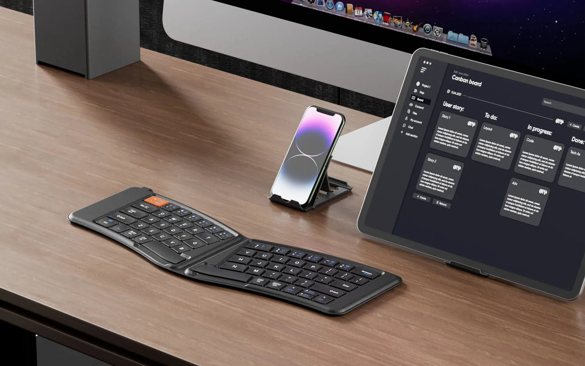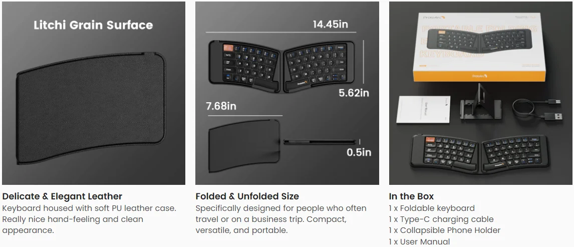 Comprar Miniteclado plegable inalámbrico, recargable por USB-C, ultrafino, dividido, ergonómico, portátil, con soporte para teléfono
