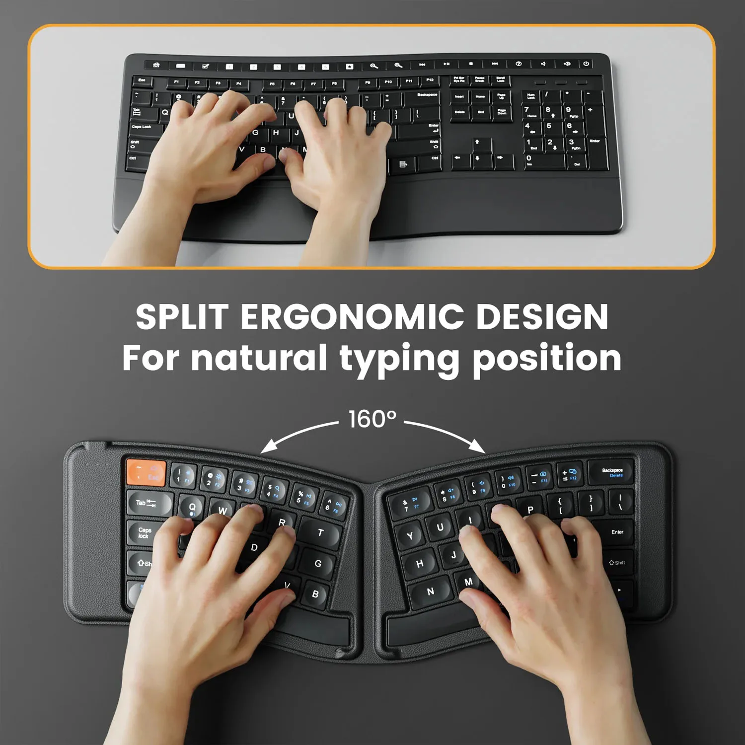 Nuestro teclado portátil tiene una forma de U única con un ángulo de 166 grados, ayuda a crear una posición de escritura natural y minimiza la presión en las manos y las muñecas. Teclas estándar integradas de tamaño completo, proporciona una escritura precisa y rápida similar a la de un portátil. Ideal para viajes y viajes de negocios.