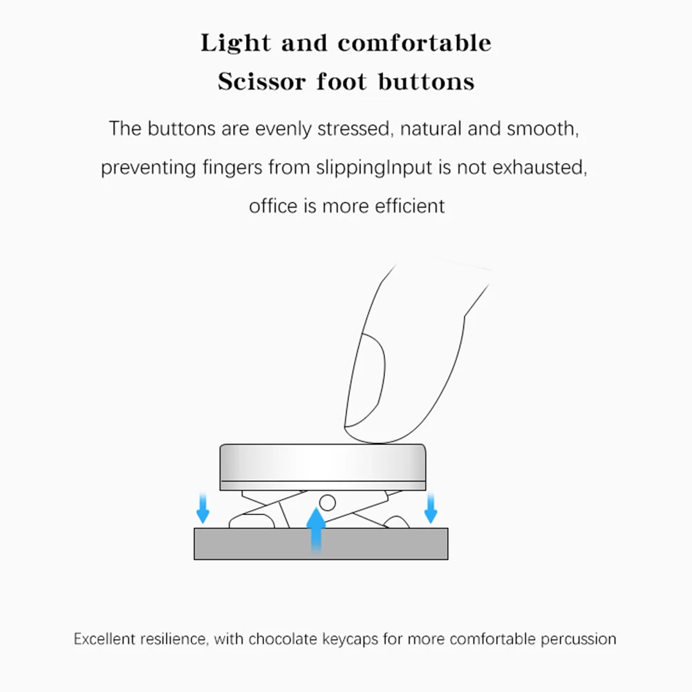 4. Llaves de pie de tijera:Las teclas están uniformemente estresadas, naturales y suaves, evitando que los dedos se deslicen, no se cansan de la entrada y son más eficientes en la oficina.