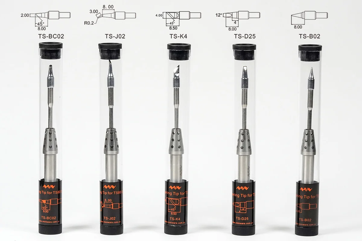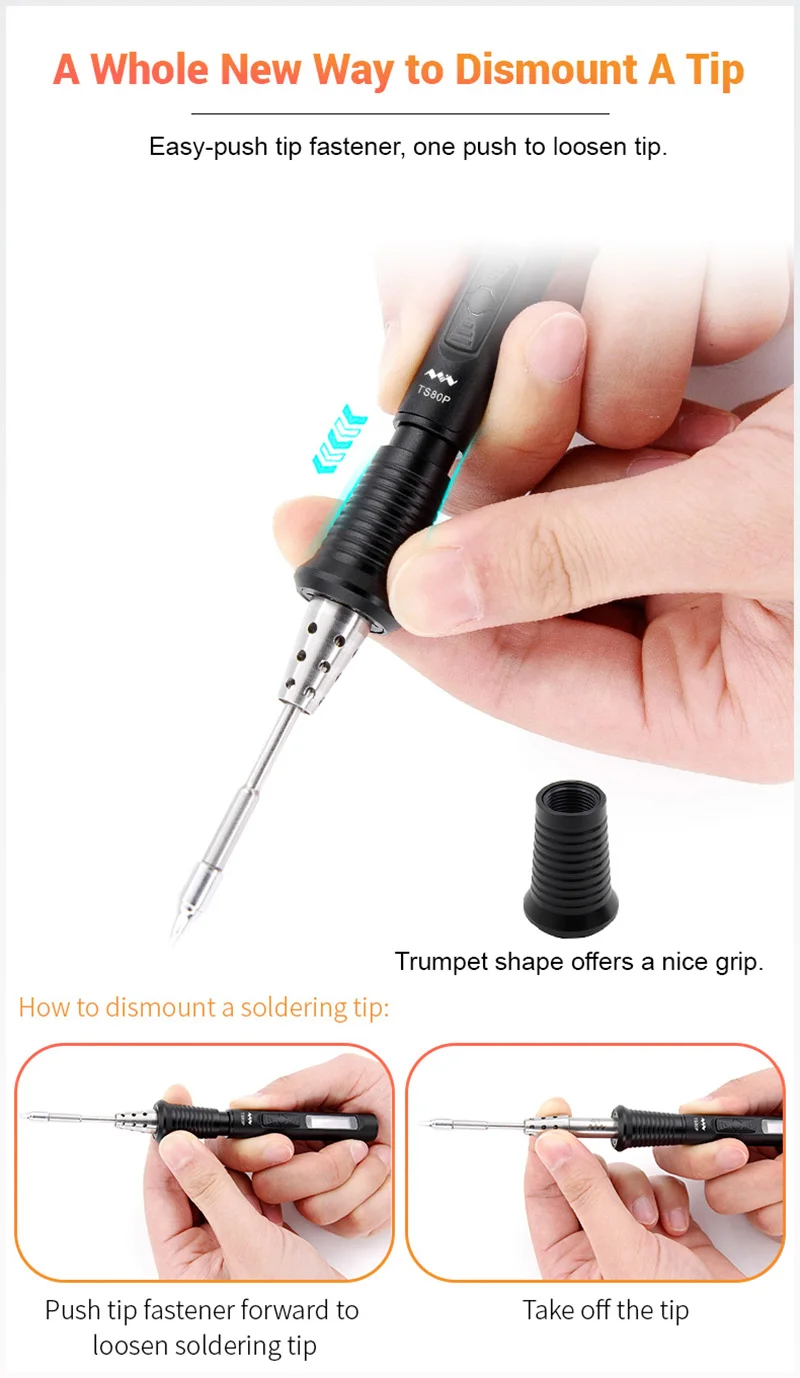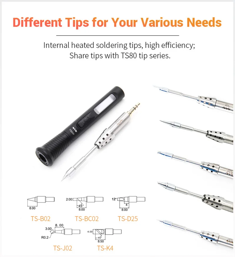 TS80P comparte los mismos consejos con TS80/TS1C.La punta de soldadura tiene un núcleo calefactor cerámico térmico interno y, a través de la conducción de calor de cobre puro, puede transferir rápidamente calor a la punta de la punta de soldadura, logrando un excelente rendimiento de control de temperatura.