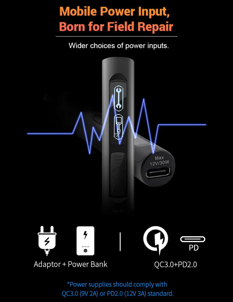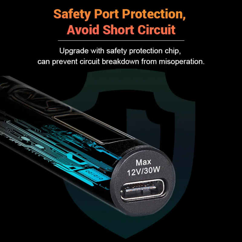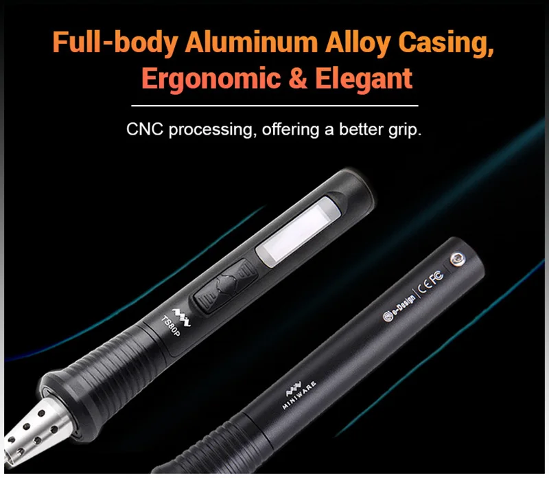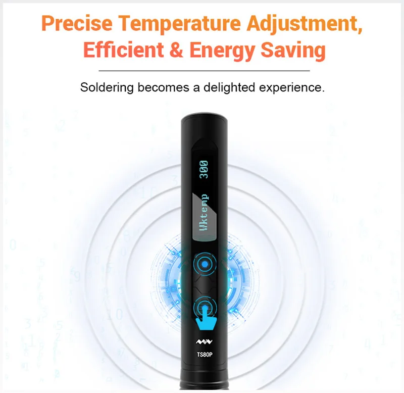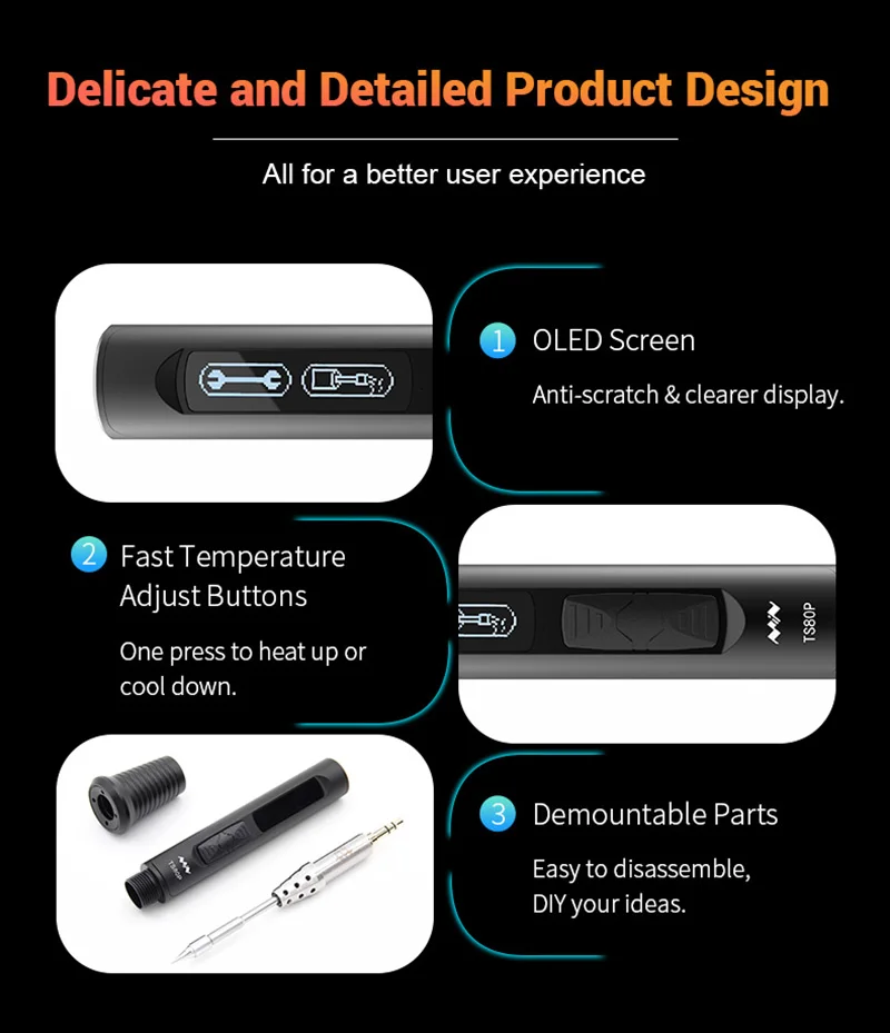 El controlador TS80P está hecho de aleación de aluminio a través de CNC en una estructura compacta y diseño de alta tecnología, ergonómico, hermoso y moderno.El controlador también está equipado con una pantalla OLED, para que puedas monitorear el estado del soldador en cualquier momento.Además, cuenta con un nuevo sujetador de punta fácil de empujar, que proporciona la mejor experiencia de sujeción y un empujón fácil para aflojar la punta de soldadura para un reemplazo rápido. Con un chip STM32 incorporado, TS80P puede controlar inteligentemente el aumento y la caída de la temperatura de la punta, y funciones de suspensión, apagado automático, protección de seguridad y otros modos.La capa de aplicación del código es de código abierto; Puede desarrollar firmware para el soldador libremente según sea necesario.
