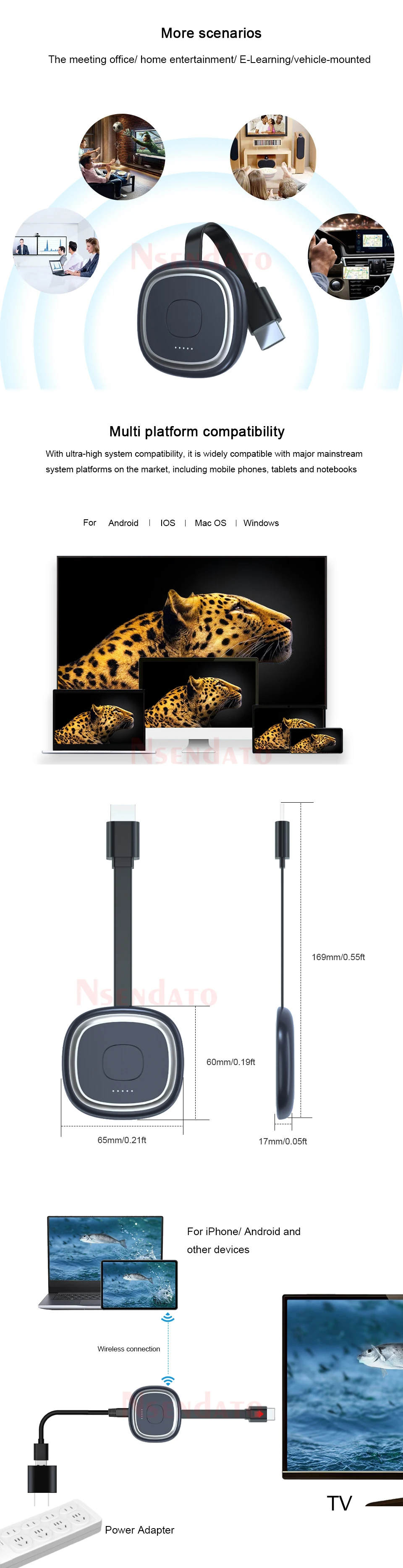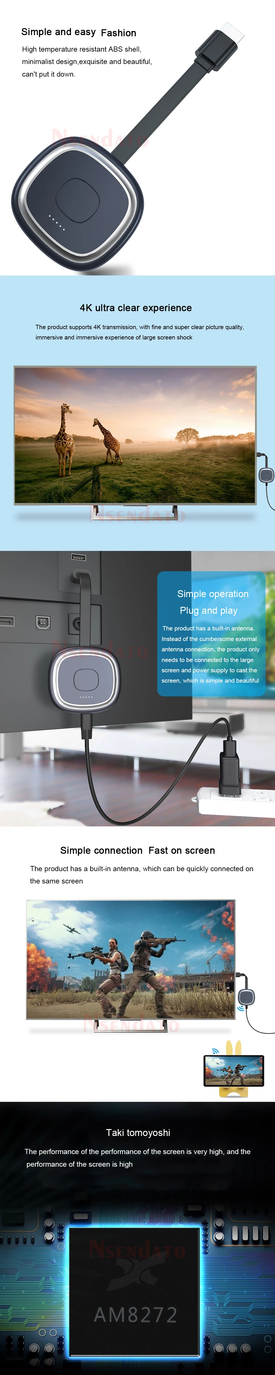 EspecificaciónVersión: 1080P/4KFrecuencia WiFi: 2,4 GHz / 5GHZ dos especificacionesAlcance WiFi: menos de 10mSoporte 4K de transmisiónInterfaz: micro USB/HDMI compatible conCPU: AM8272Fuente de alimentación: 5V/2aFormato de Video: AVI. DIVX MKV... DAT: VOB... MPG,MPEG MOV MP4... RM RMVB... WMVFormato de imagen: JPEG,BMPFormato de Audio: MP1/2/3 WMA OGG,WAV,AACFormato de archivo: PDF de Adobe Microsoft Word/Excel/PowerPointCaracterística:1. Imágenes compatibles con HDMIEl puerto compatible con HDMI de Este dongle de pantalla inalámbrica admite transmisión de vídeo 4K y salida de sonido de alta calidad. Puedes conectar tu smartphone, portátil o iPad a un televisor, proyector o monitor, y cualquier cosa que ves en tu dispositivo móvil se reflejará en una pantalla más grande,. Facilita el reloj y es adecuado para compartir.2. Admite múltiples dispositivosSi aún no sabes cómo hacerlo, ponte en contacto con el equipo de servicio. Puede ajustar el sistema Miracast o AirPlay/DLNA para admitir dispositivos IOS o Android. Compatible con Android 4,4 + OS X 10,9 + iOS 8,0 + para Windows 8,1/10 Fácil de cambiar, Solo tienes que mover los dedos. También se puede utilizar como pantalla WiFi para coche (como CarPlay) y un excelente compañero de viaje, solo tienes que conectar el G20 a un puerto compatible con HDMI para coche.3. dongle de pantalla Wifi estableAdaptador de espejo de pantalla de TV Nsendato. La señal Wifi de antena externa de 10m proporcionará una señal inalámbrica más estable que otros dispositivos (Wi-Fi: 2,4 GHz/5GHZ). Adaptador para transmisión de vídeo, navegación web, visor de fotos, intercambio de cámara en tiempo real, reproductor multimedia. ¡Casi no hay retraso! Tu vida será fácil.4. Fácil de operarNo se requiere ninguna aplicación ni controlador de software. En solo 3 pasos, puede disfrutar fácilmente de música, videos, fotos, archivos de oficina y sitios web en la pantalla grande: Plug- Connect- Mirror. Conéctelo al puerto compatible con HDMI del televisor y use una potencia de 5V/2mA, luego conecte el dispositivo a través del modo Miracast, Airplay o DLNA con instrucciones, Y finalmente refleja los medios en la pantalla grande.El paquete incluye:1 receptor Dongle de pantalla Wi-Fi inalámbrico1X WiFi USB Cable1X Manual de usuario en inglés