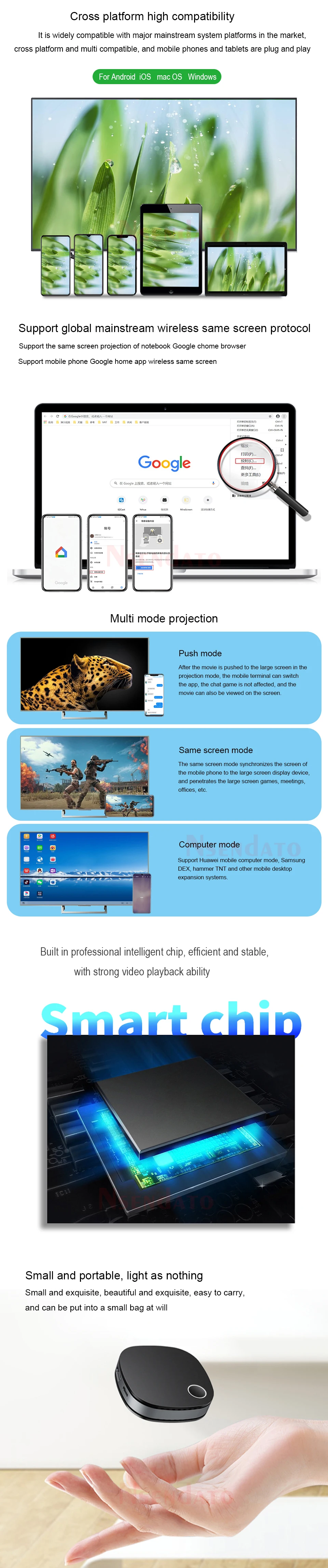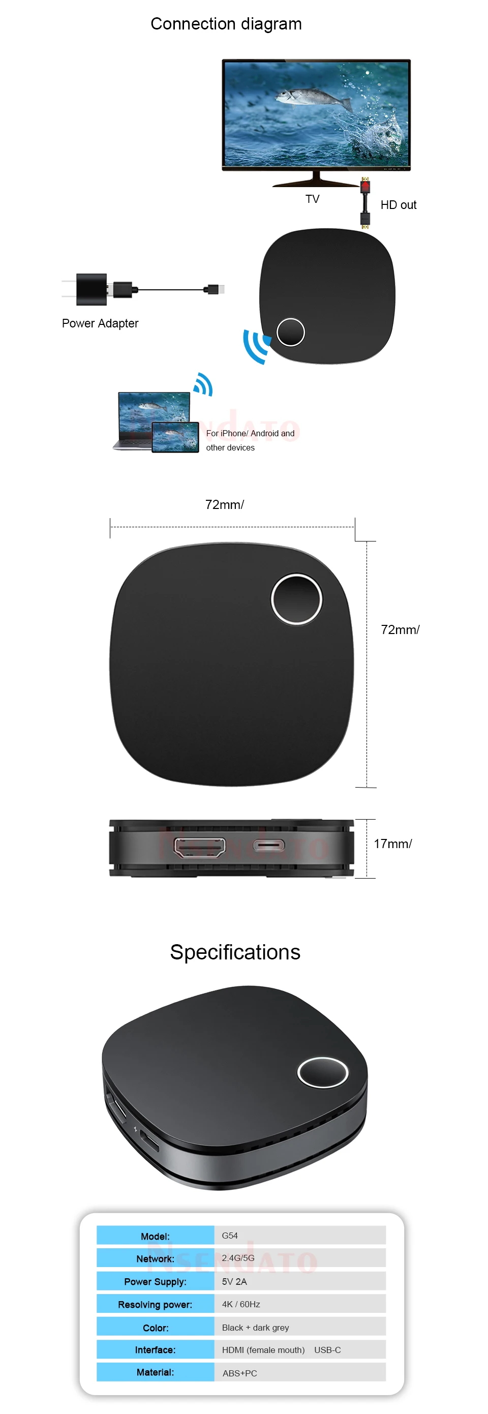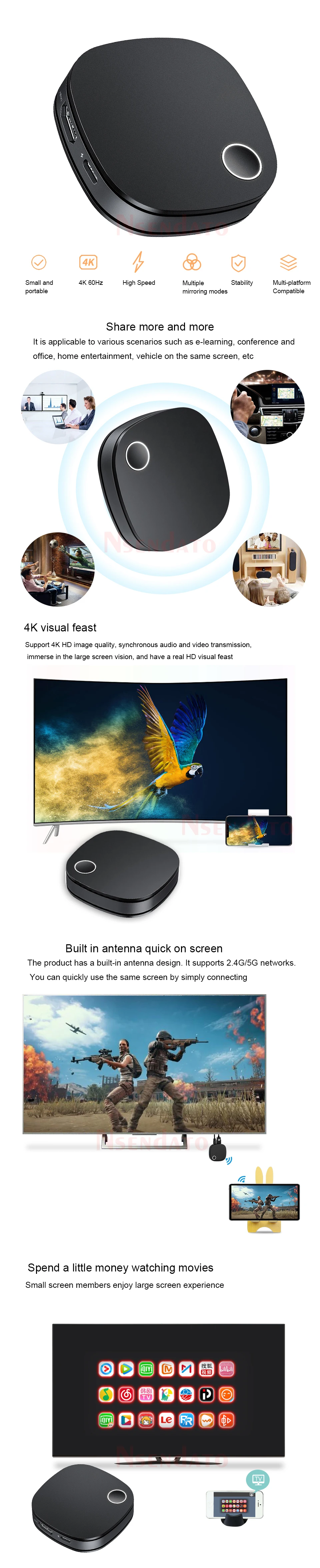 Nsendato G54 is exclusive to the market, with zero freeze and zero delay, redefining the same screen standard. Support that App(you know what app it is), support computer browser on the same screen.FeatureThe new AM8272 dual-core ARM processorSupport H.265 decoding, save bandwidth, smoother on the same screenApple Android operation free switching programCoexistence of three channels: support direct connection, routing and P2P modeSupport video resolution up to 4K UHDSupport online upgrade, users do not need to set, automatic upgrade support iOS 13.SpecificationsMain chip: Dual-core Cortex A7 up to 1.5GHzDC: 1 Micro Mini USB portSupport picture format: GIF/JPEG/BMP/TIF/JPG/TIFFOperating system: Support Android OS 4.0/IOS 6.0/Mac or higherInterface: 1 male HDMI-compatibleSupport audio format: MP1/MP2/MP3/WMA/OGG/ADPCM-WAV/PCM-WAV/AACNo switch: no need to switch between different operating system devicesSupport video formats: MKV, WMV / VC-1 SP / MP / AP, MPG, MPEG, DAT, AVI, MOV, ISO, MP4, RM, H.265,Real Video 8/9/10, up to 1080POperating system: Linux 3.0.8Support: Video / Audio / Photo / Office Files / WebsitePackage Include1xWireless Wi-Fi Display Dongle Receiver1x 2 in 1 WiFi USB Cable1x English User ManualNoted:it is not ok for Netflix