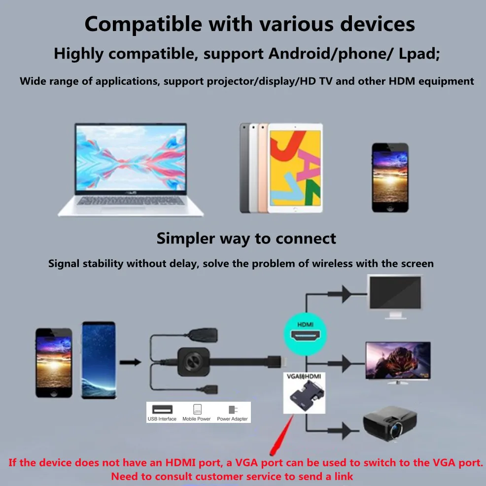 Compatible con 1080P, puede conectar PC, teléfono inteligente o iPad a TV o proyector, lo que sea que vea en la pantalla de su dispositivo móvil, puede reflejar en el HDTV o proyector, crea tu propio cine exclusivo, disfruta de diferentes festines audiovisuales