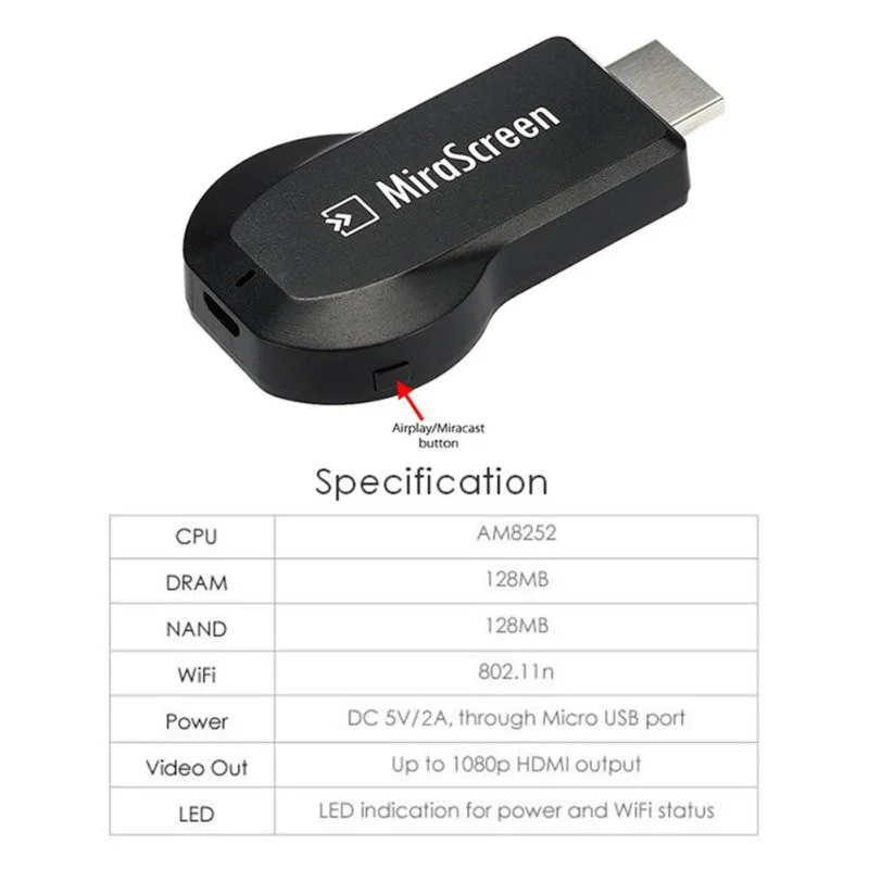 Comprar Mirascreen-receptor inalámbrico 128 P HD, WiFi, TV Stick Dongle, reproductor de Audio y vídeo para Apple, Android, Streamer, Youtube, 1080 M
