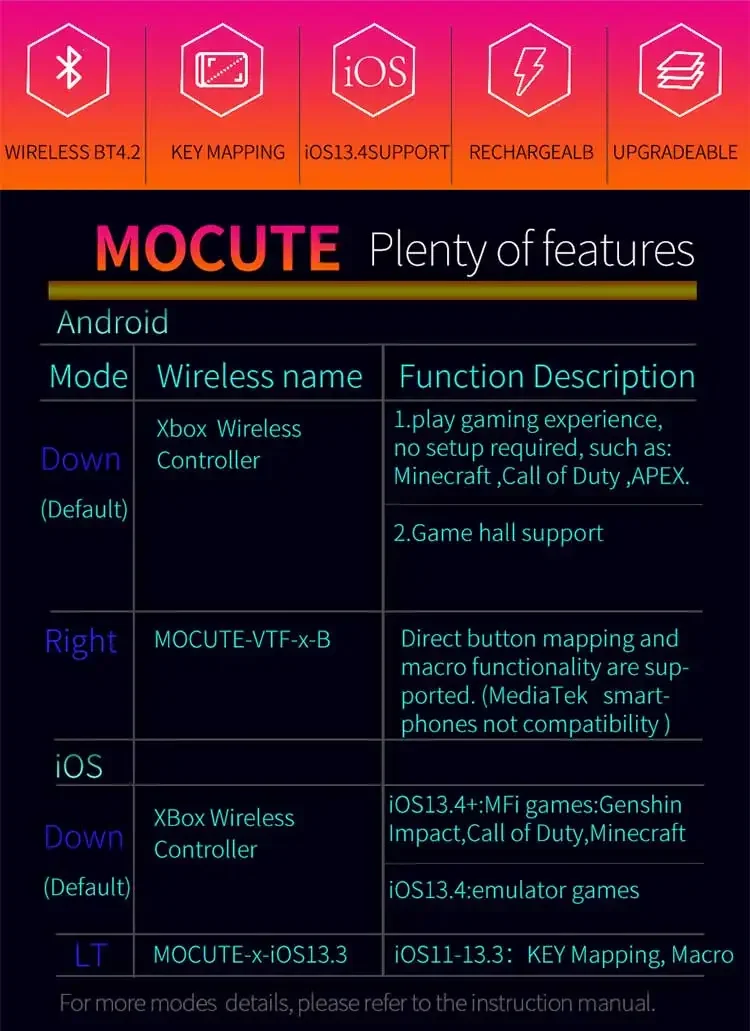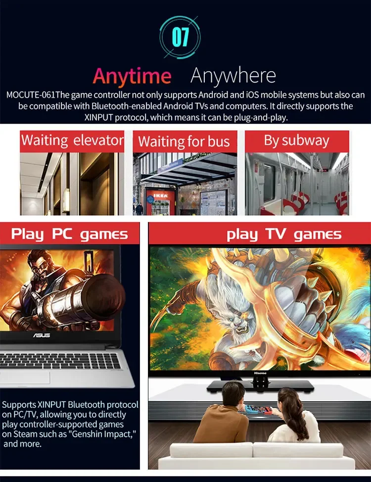 Este es un gamepad inalámbrico portátil, utilizado para teléfonos móviles, MID, TV box, smart TV, PC, etc.Es compatible con iOS, Android, VR, PC, etc.