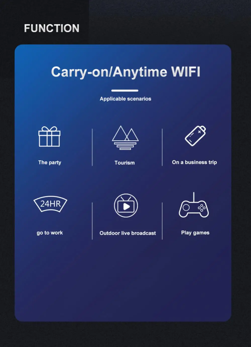 El producto está diseñado principalmente para SOHO, usuarios de vehículos, viajeros de negocios al aire libre y viajeros, admite hasta 10 usuarios al mismo tiempo, consumo de energía; elegante, compacto y portátil le permite disfrutar de Internet de alta velocidad en cualquier momento y en cualquier lugar.