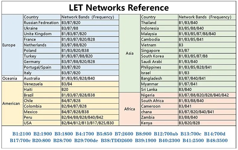 Note: This product does not include a SIM card, and the network frequency bands of different operators are different. Before purchasing, please check the local frequency band corresponding to the frequency band table below, and check with your operator whether your SIM card supports this frequency band, and choose a suitable and affordable one. SIM card package use