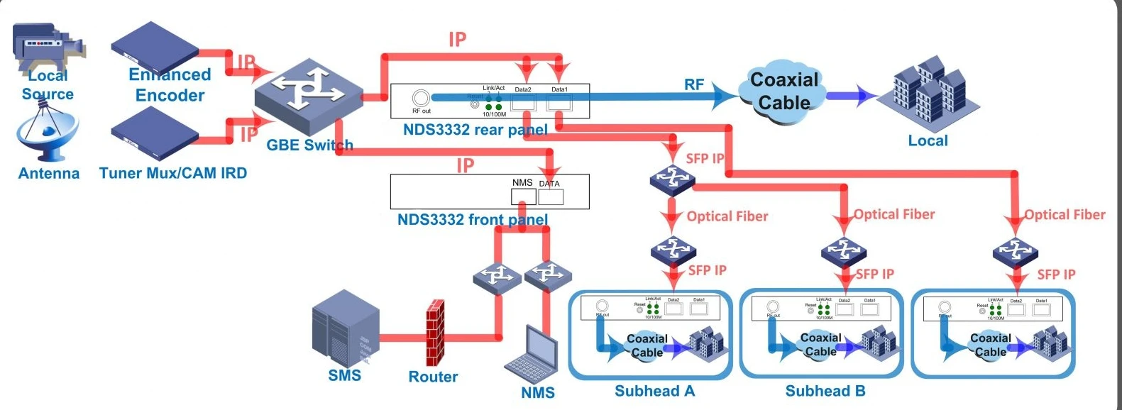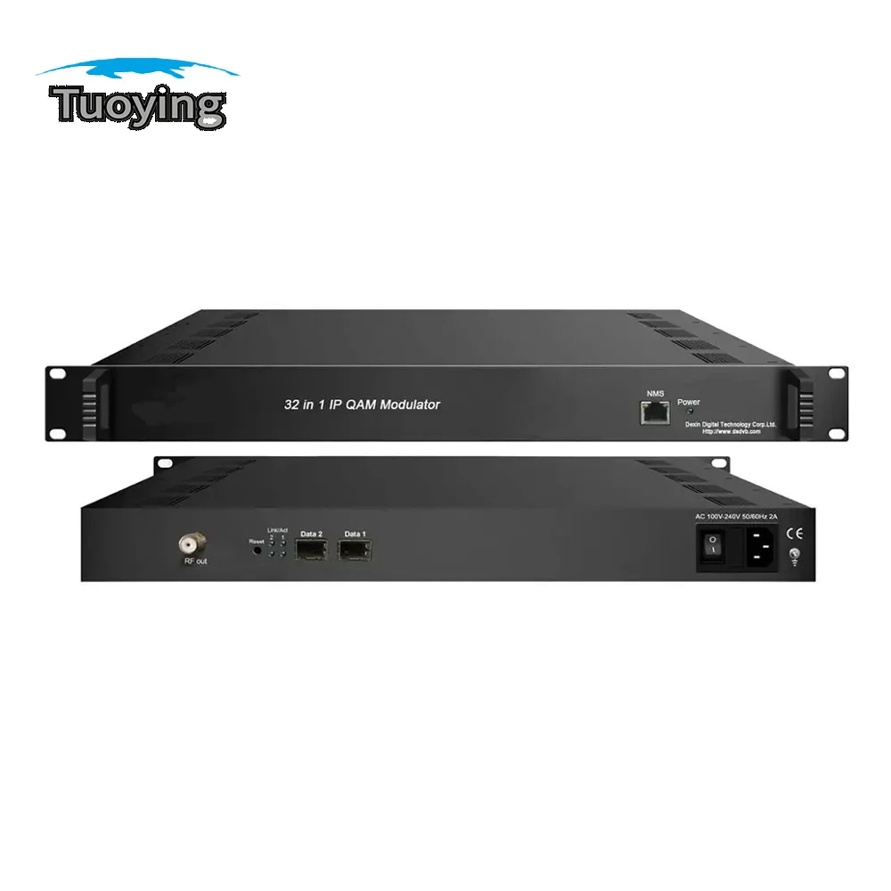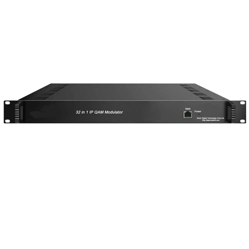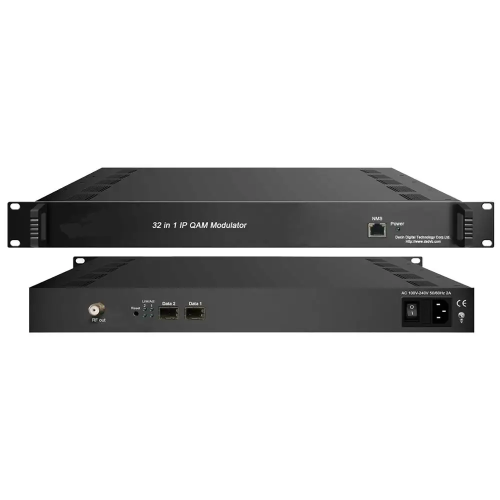 El modulador NDS3332 IP QAM es un dispositivo todo en uno de modulación Mux desarrollado por DEXIN. Tiene 32 canales de multiplexación, 32 canales de codificación y 32 canales de modulación QAM (), Y admite una entrada IP máxima de 1024 a través del puerto GE y una salida de 32 portadoras no adyacentes (50MHz ~ 960MHz) a través de la interfaz de salida RF. El dispositivo se caracteriza por tener dos puertos de salida de RF que amplían el ancho de banda para portadores QAM.