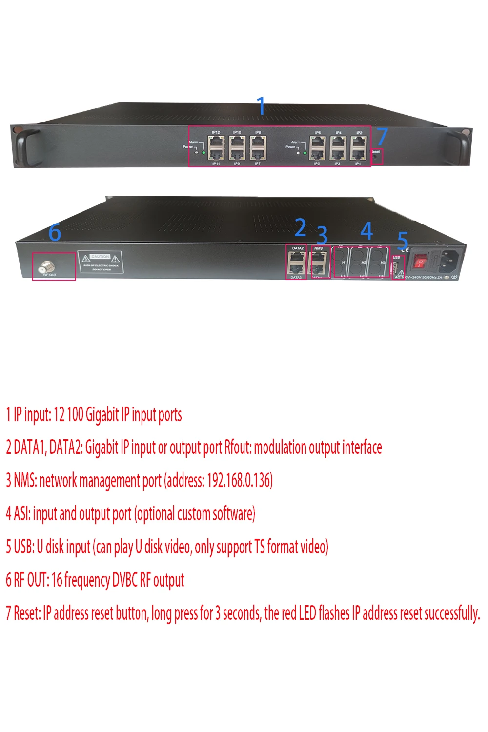El modulador IP NM1408 es un local comercial especial para resolver la fuente de señal de TV digital con IP de alto rendimiento y rentable al modulador estándar nacional DTMB.El dispositivo tiene 12 puertos de red de 100 megabits en el panel posterior, 2 entradas de puerto de red gigabit en el panel frontal, 14 puertos de red son entradas de señal IPTV;1 puerto de salida RF y 1 puerto de gestión de red en el panel frontal, el puerto RF admite 16 salidas DVBC, el dispositivo tiene las características de alto rendimiento y bajo costo, lo cual es muy adecuado para diversos locales comerciales (como: hoteles, casas de huéspedes)., discotecas, casas de té, etc.)Uso del sistema frontal de TV digital.