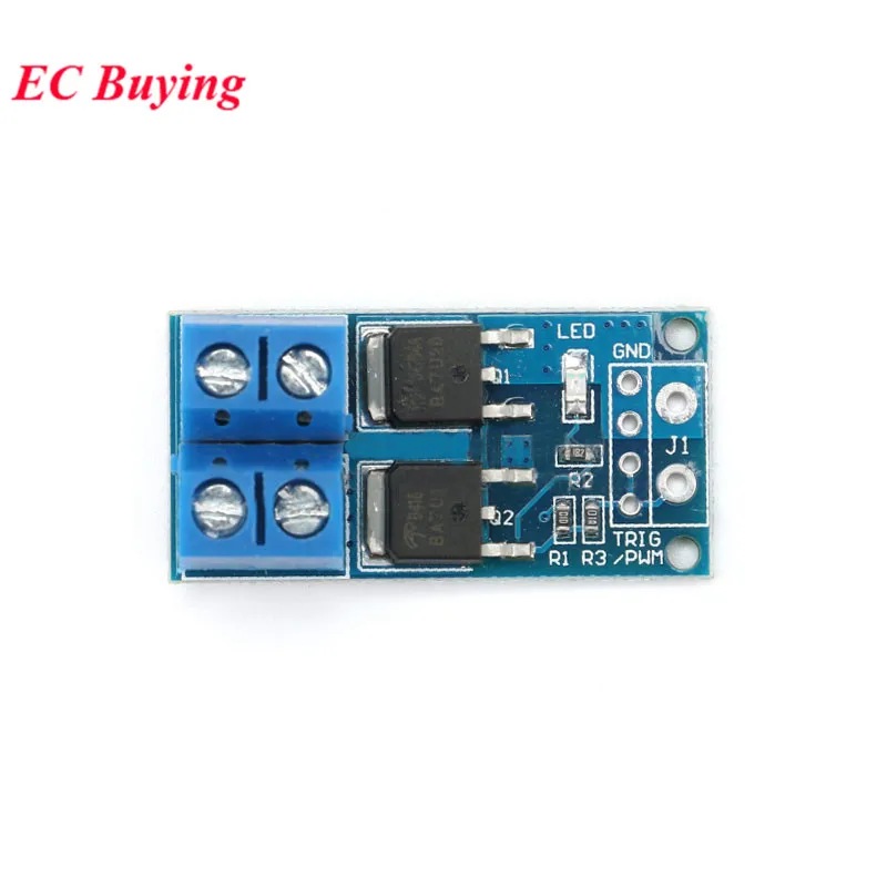 The module supports high-level triggering, low-level triggering, switching control and PWM control. The module adopts imported dual MOS parallel active output, which has lower internal resistance, higher current and strong power. 10A and 600W at room temperature meet It is used by most devices and supports a wide operating voltage (DC4-60V), which can easily control high-power devices.Parameter:1. Working voltage: DC 4V-60V2. Trigger signal source: high level trigger (DC3.0V-24V)Low level trigger (DC 0.0V~0.6V)On-off control, can be connected to single chip IO port, PLC interface, DC power supply, etc. can be connected to PWM signal, signal frequency 0-2.5KHZ support.3. Output capacity: DC DC 4V-60V, continuous current 10A at normal temperature, power 600W! Under auxiliary cooling conditions, the current can reach 15A.4. Service life: unlimited switching5. Working temperature: -40—85°C6. Size: 4.6*2.9*1.5cmApplication:The output can control high-power devices. Motors, light bulbs, LED strips, DC motors, miniature water pumps, solenoid valves, etc.. You can input PWM to control the motor speed and the brightness of the lamp.Precautions:1. At the same time, there can only be one signal to control this module, and you cannot use two or more signals to control this module at the same time;2. High-level trigger voltage range: DC3.0V~24V, that is, when the signal is 3.0V~24V, the MOS tube is turned on. Below 0.6V. That is, 0V~0.6V. The MOS tube is turned off, and the signal voltage must not be at 0.6V Between ~3.0V, so that the MOS is not fully turned on, burned MOS with high power;3. Low-level trigger voltage range: DC0V~0.6V, that is, the MOS tube is turned on when the signal voltage is 0V~0.6V, higher than 3.0V, the MOS tube is turned off, and the signal voltage must not be between 0.6V~3.0V, In that case, the MOS is not fully turned on, and the MOS is burned with high power.