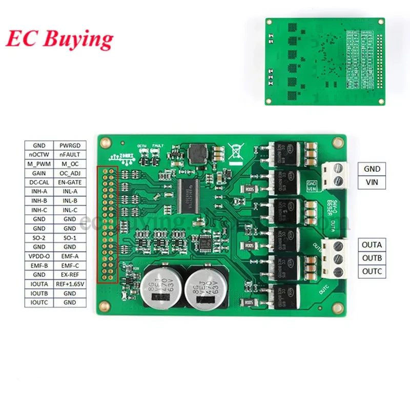 Product description:1. Rated power input range: 5.5V-45Vdc, output rated drive current 15A (no radiator installed at room temperature).2. On-board three-phase external current amplifier circuit with a gain of 12.22 and a full-amplitude current of ±27A.3. Onboard three opposite electromotive force sampling circuit and power sampling circuit, the signal attenuation ratio is 5.1/73.1.4. Optional three-phase differential current amplifier reference level for connection to 5V or other level systems.5. Reserved and equipped with the DRV8302 internal dual amplifier output.6. Three external current differential amplifiers support ST FOC library applications.7. Support BLDC non-inductive brushless motor drive application development.Common problem:Q: How can I develop a non-inductive BLDC driver using this module?A: The DRV8302 motor drive module has three opposite electromotive force BEMF outputs, which can be used for sampling and changing.Phase signal.Q: Do you support the ST FOC library?A: The DRV8302 driver board is designed with three external currents in addition to the two chip internal current amplifiers.The amplifier circuit supports the ST FOC library three-resistor current sampling mode.