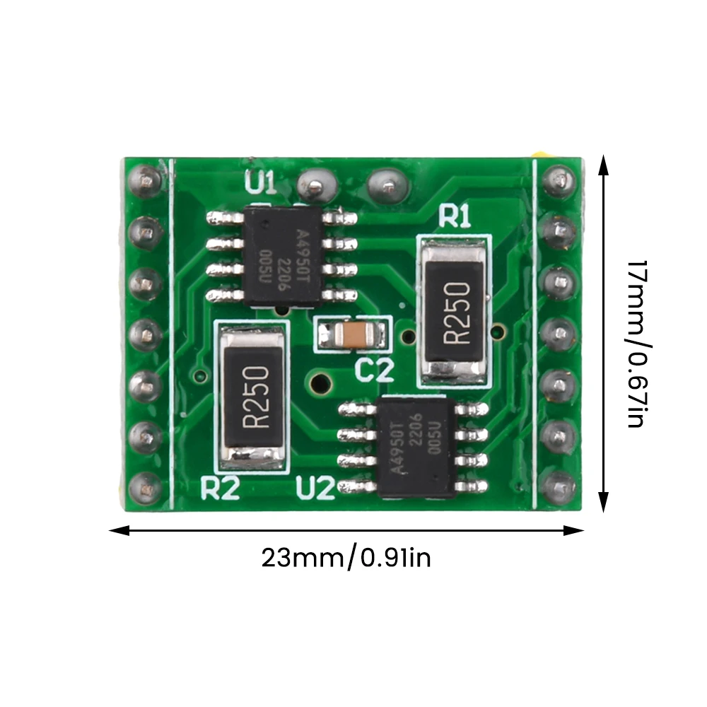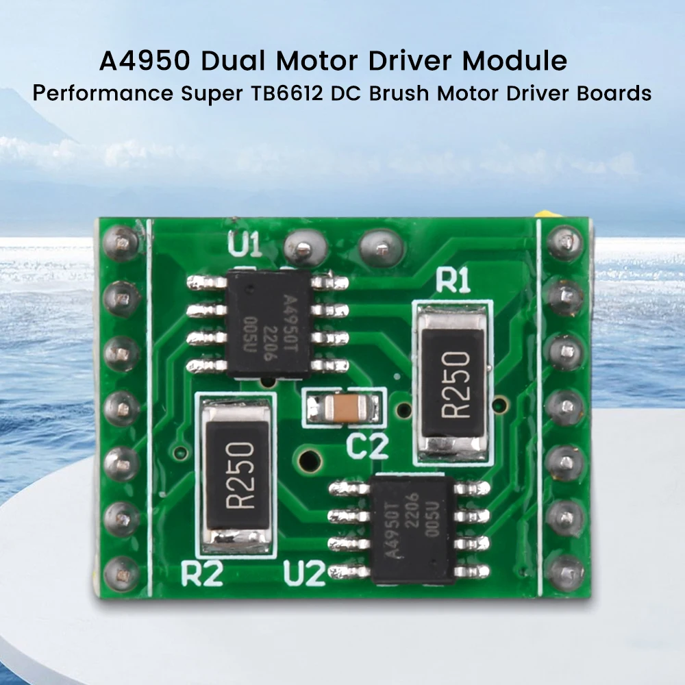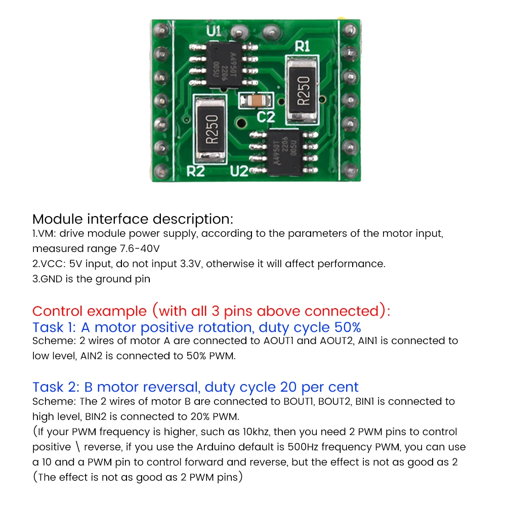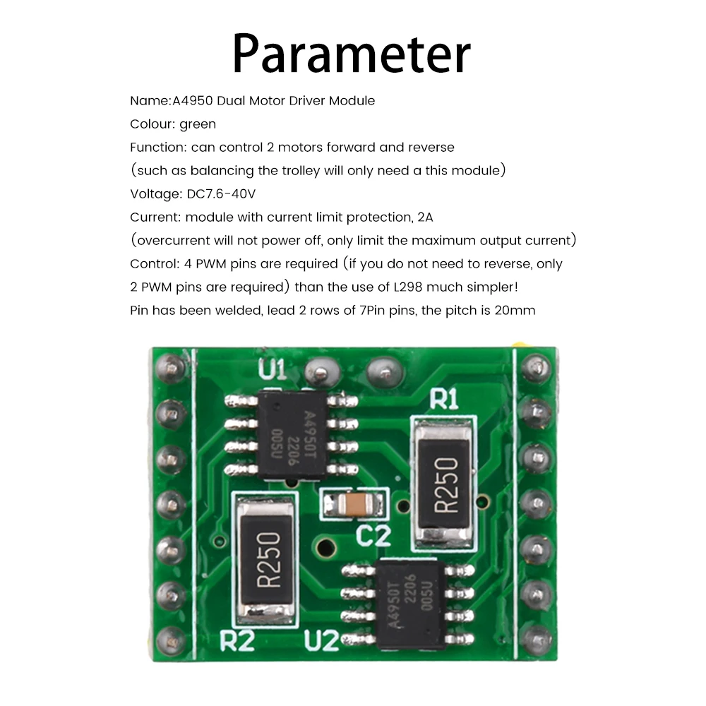 Característica: 1. Los productos están hechos de materiales de alta calidad, rendimiento estable y calidad garantizada 2. Chip: A4950, voltaje de suministro: 3. Salida de 2 motores, puede controlar la rotación positiva y negativa de dos motores al mismo tiempo, ya que el coche de equilibrio solo necesita un módulo. 4. El rendimiento supera TB6612 5. Módulo limitadora de corriente con protección, corriente 2A, La sobrecorriente no se apagará, solo limitará la corriente máxima de salida 6. Rango de frecuencia de accionamiento recomendado: 500HZ-30KHZ Parámetros: Nombre: módulo de accionamiento de motor dual A4950 Color: Verde Función: puede controlar la rotación positiva y negativa de dos motores (como el coche de equilibrio solo necesita un módulo) Voltaje: DC7.6-40V Corriente: módulo con protección limitadora de corriente, 2A (La sobrecorriente no se apagará, solo limitará la corriente de salida máxima) Control: Requiere 4 pines PWM (solo 2 pines PWM si no se requiere inversión) para un uso mucho más simple que el L298 Los pines han sido soldados, salen 2 filas de pines de 7 pines, el espaciado es de 20mm. Descripción de la interfaz del módulo: 1.VM: la fuente de alimentación del módulo de accionamiento. Según la entrada de parámetros del motor, el rango medido es de 7,6-40V. 2.VCC: Use una entrada de 5V, NO INGRESE 3,3 V, de lo contrario el rendimiento se verá afectado 3.GND es un PIN de tierra Precauciones de uso: Cuando use la placa de circuito, tenga cuidado de no invertir la conexión de alimentación La temperatura de almacenamiento de la placa de circuito no debe exceder los 55 grados, la humedad es inferior al 60% Paquete incluido: 1 x A4950 Módulo de accionamiento de motor dual Rendimiento Super TB6612 Placa de controlador de motor cepillado de CC