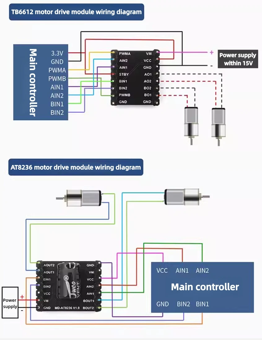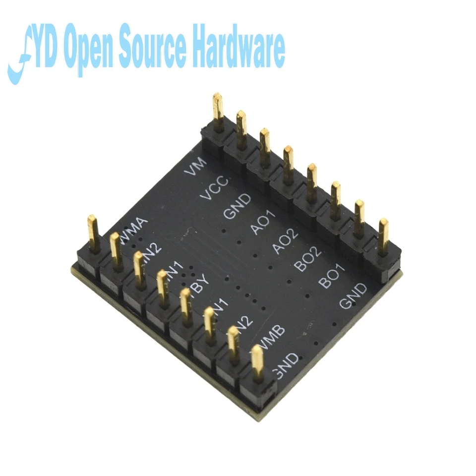 TB6612FNG es un chip controlador de motor de CC.Cuenta con una estructura de puente MOSFET-H de alta corriente y una salida de circuito de doble canal, capaz de accionar dos motores simultáneamente.Tiene cuatro modos de control del motor: rotación hacia adelante/rotación inversa/frenado/parada.PWM admite frecuencias de hasta 100 KHz