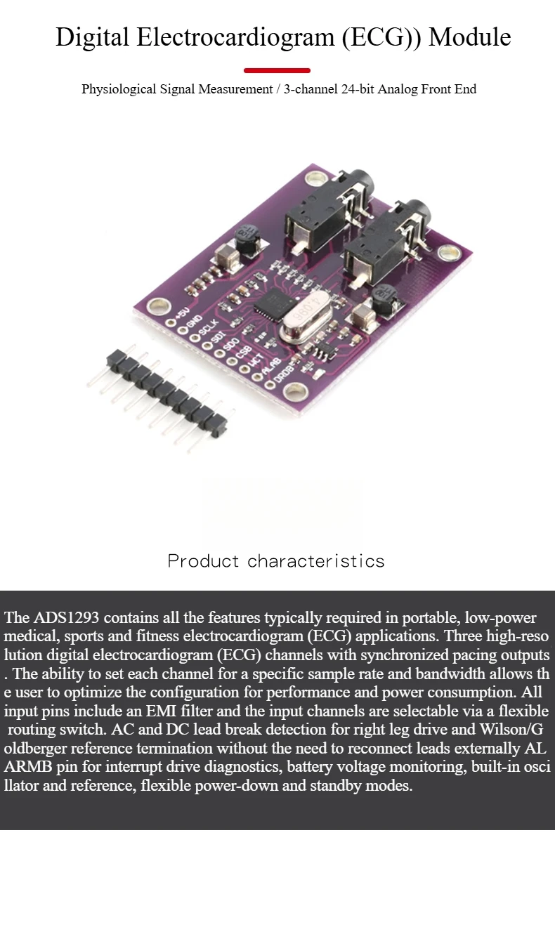 Módulo ADS1293, electrocardiograma digital (ECG) Medición de señal fisiológica/frontal analógico de 3 canales y 24 bits