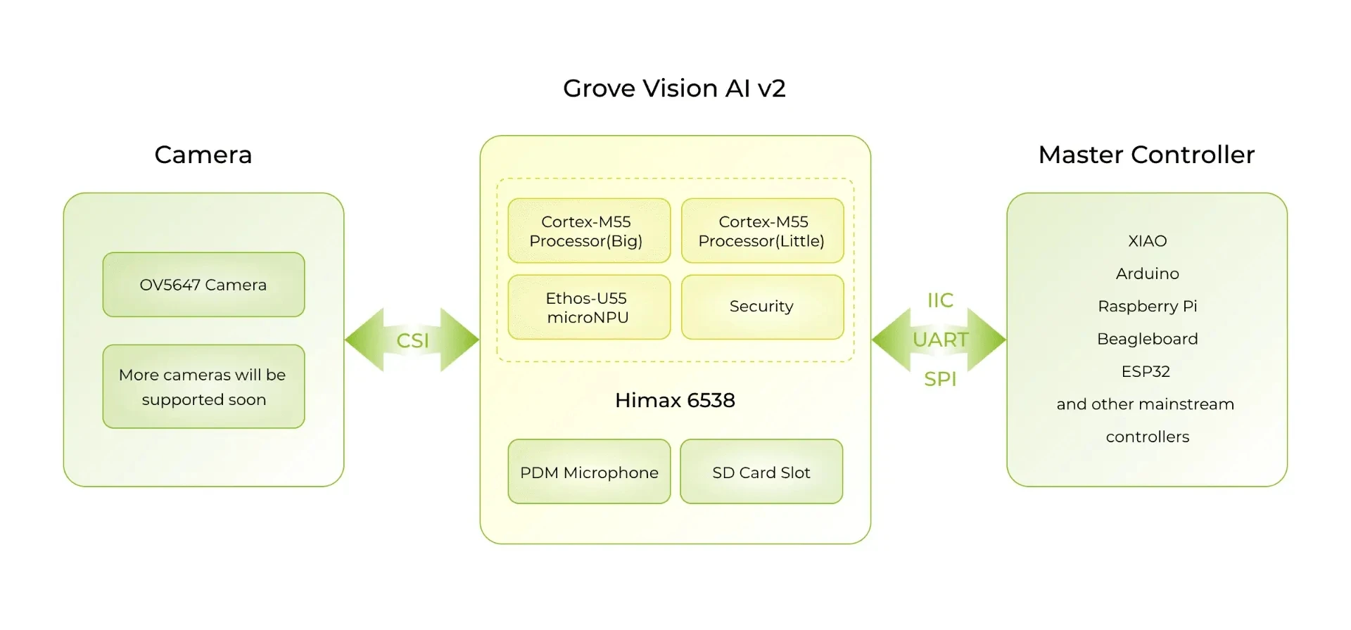 🌱Powerful AI Processing Capabilities: Utilizes WiseEye2 HX6538 processor with a dual-core Arm Cortex-M55 and integrated Arm Ethos-U55 neural network unit.