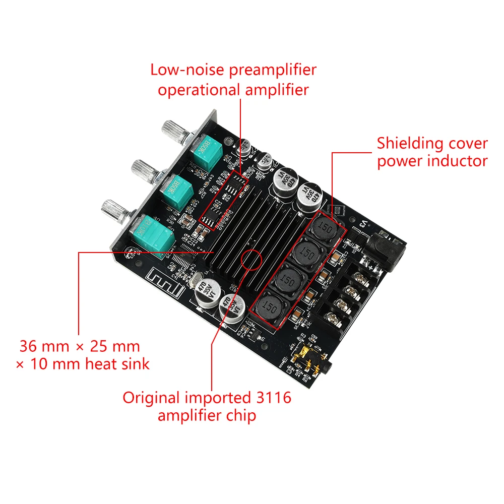 Chip amplificador: TPA3116D2 (con función de supresión de interferencias AM)