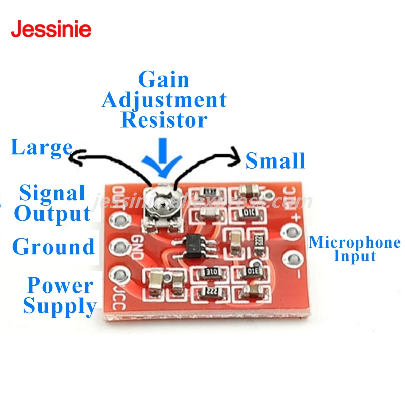 Descripción del módulo La placa amplificadora de micrófono electret utiliza el chip amplificador electret MXA4466 importado.La ganancia de la versión ajustable se puede ajustar ajustando la resistencia ajustable integrada.La ganancia de la versión fija se puede ajustar cambiando el valor de la resistencia de R6 (R6 tiene almohadillas de soldadura en ambos extremos, lo que permite cambiar la resistencia del chip por una resistencia enchufable).
