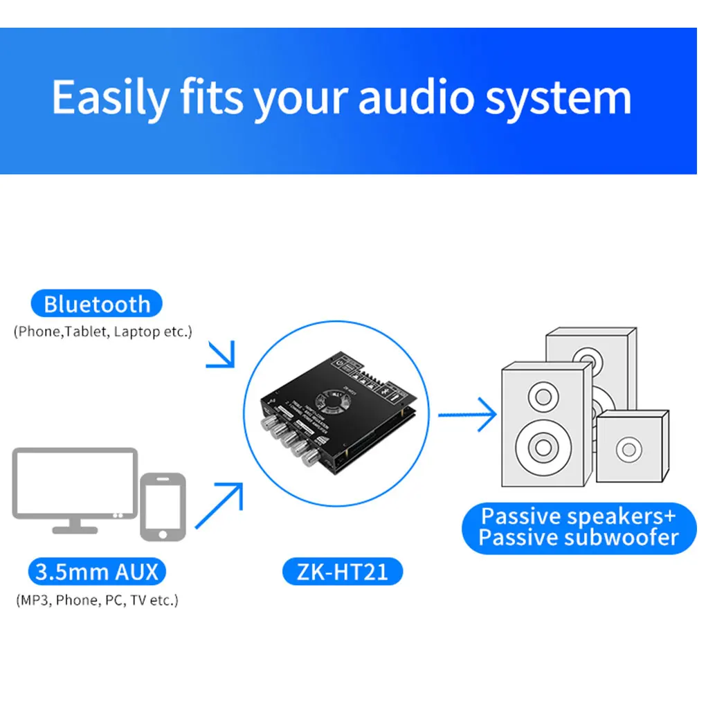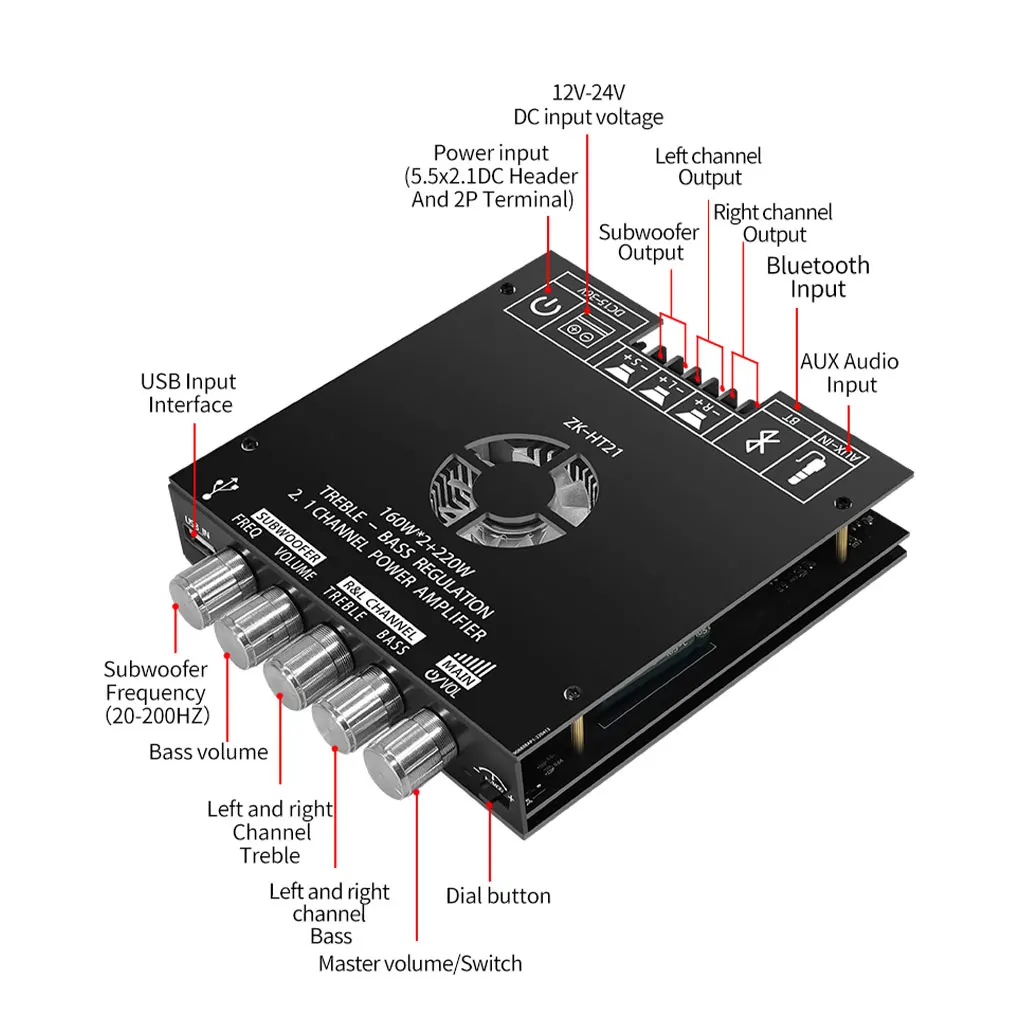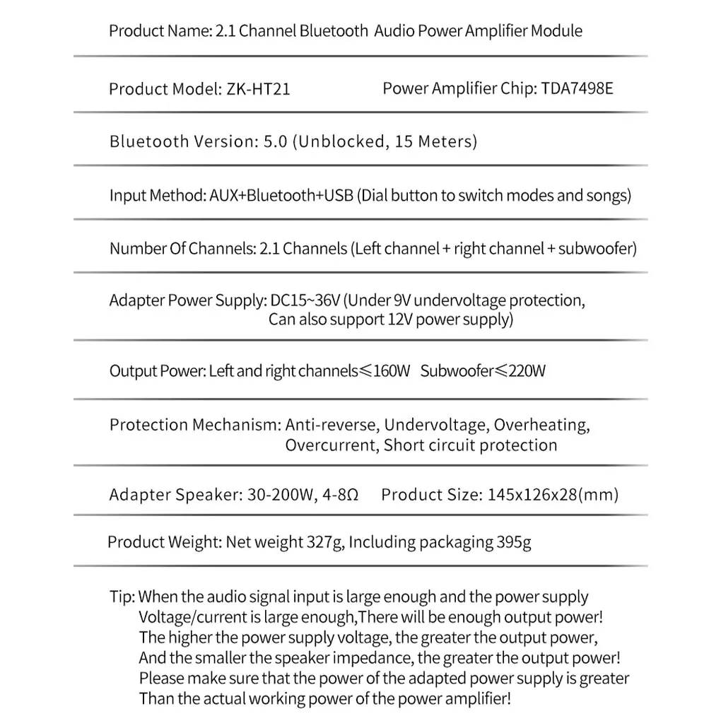 Características: módulo amplificador de potencia de 2,1 canales AUX + compatible con Bluetooth + USB + modo de corte de canción clave.