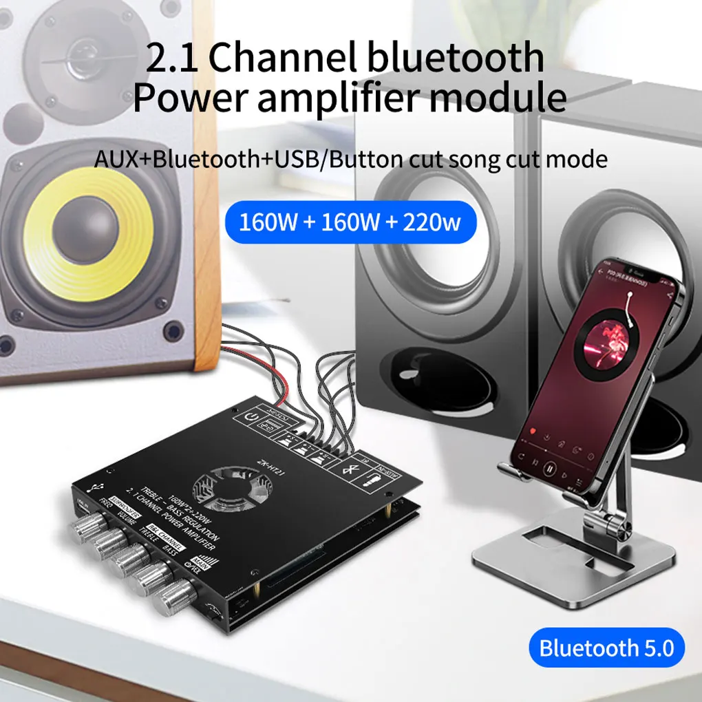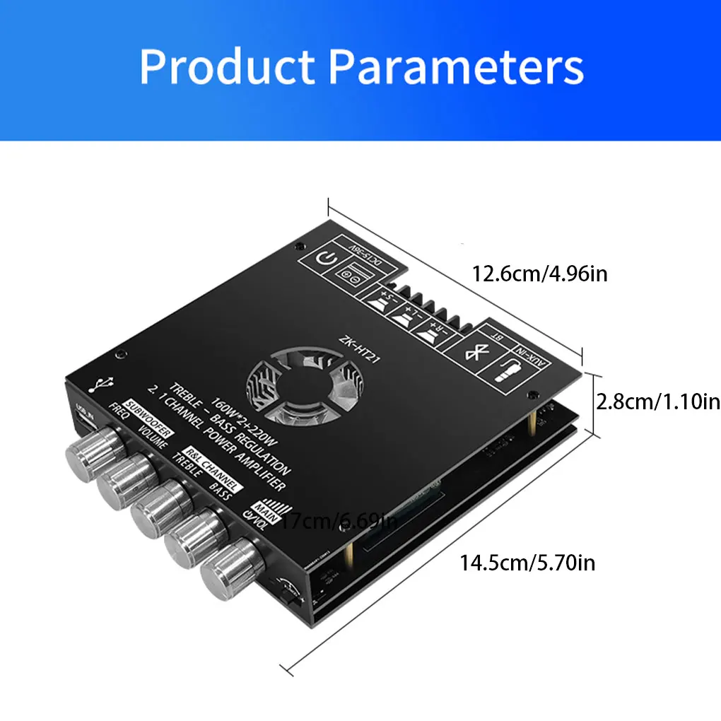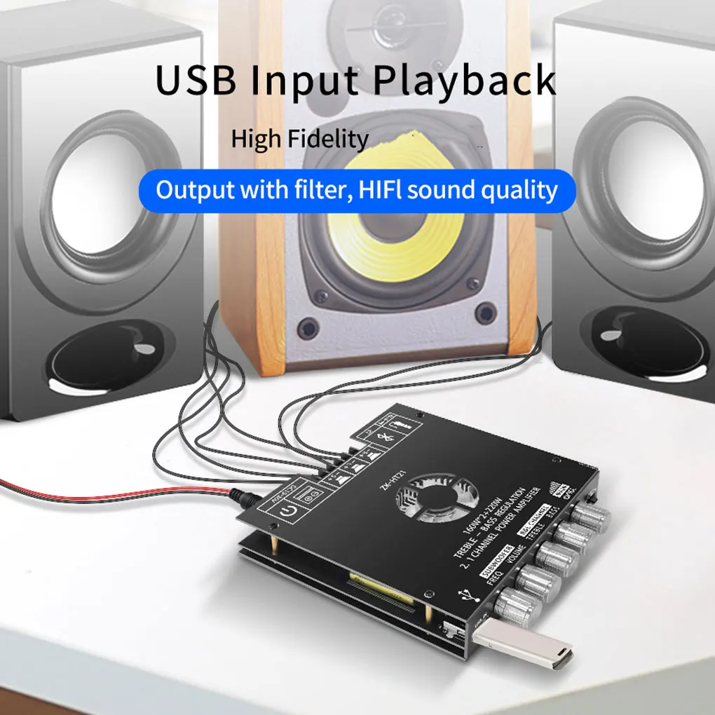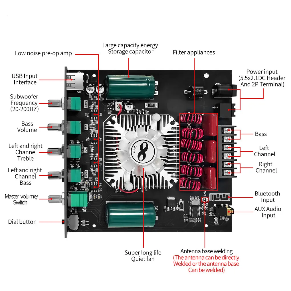 Características: módulo amplificador de potencia de 2,1 canales AUX + compatible con Bluetooth + USB + modo de corte de canción clave.
