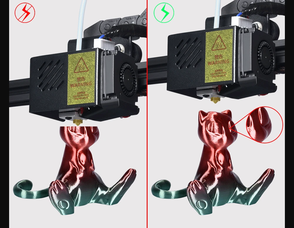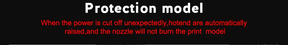 Modelo de protección:Cuando la energía se corta inesperadamente, el hotend se eleva automáticamente y la boquilla no quemará el modelo de impresión.