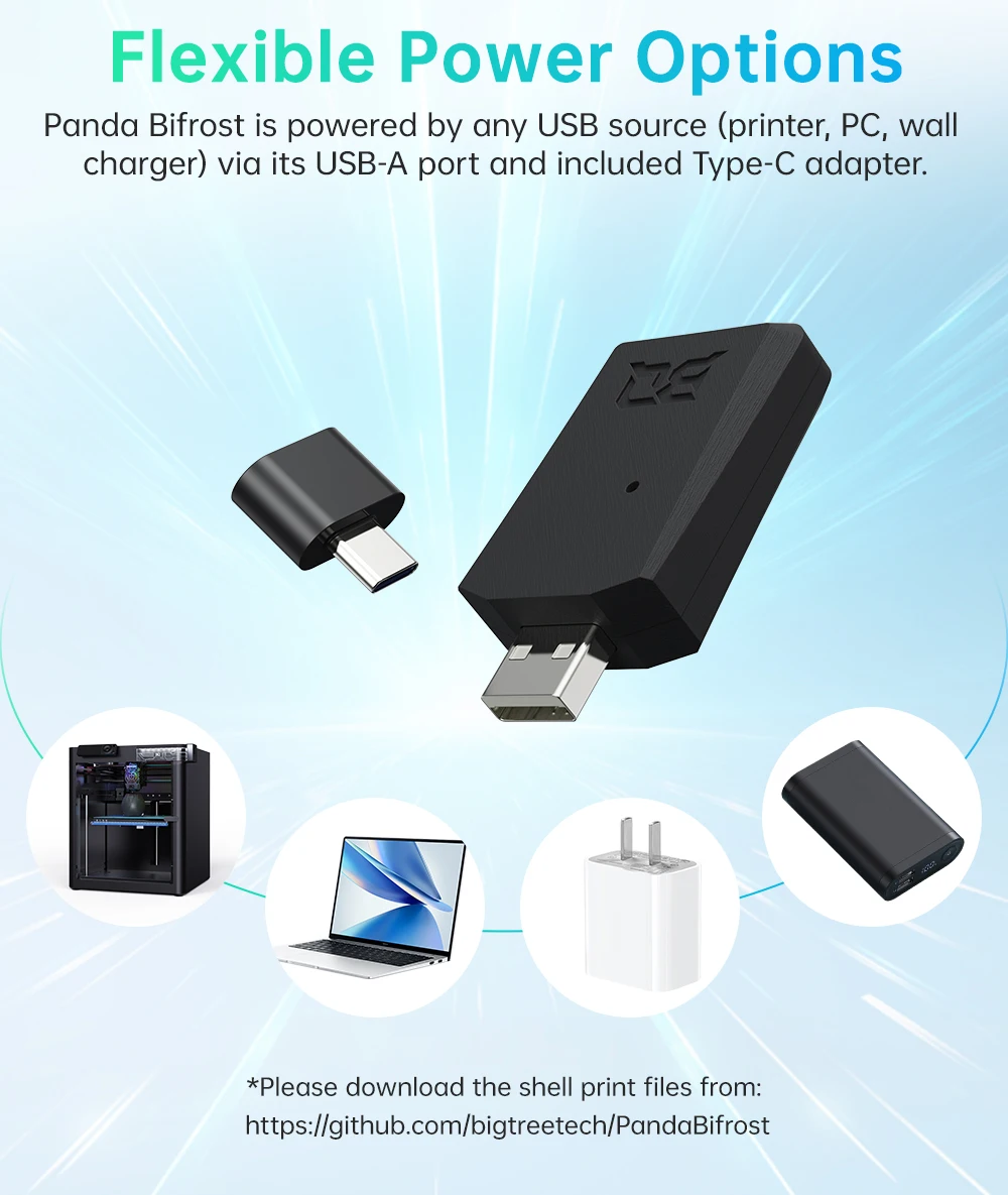 Panda Bifrost se alimenta con cualquier fuente USB (impresora, PC, cargador de pared) a través de su puerto USB-A y adaptador tipo C incluido.
