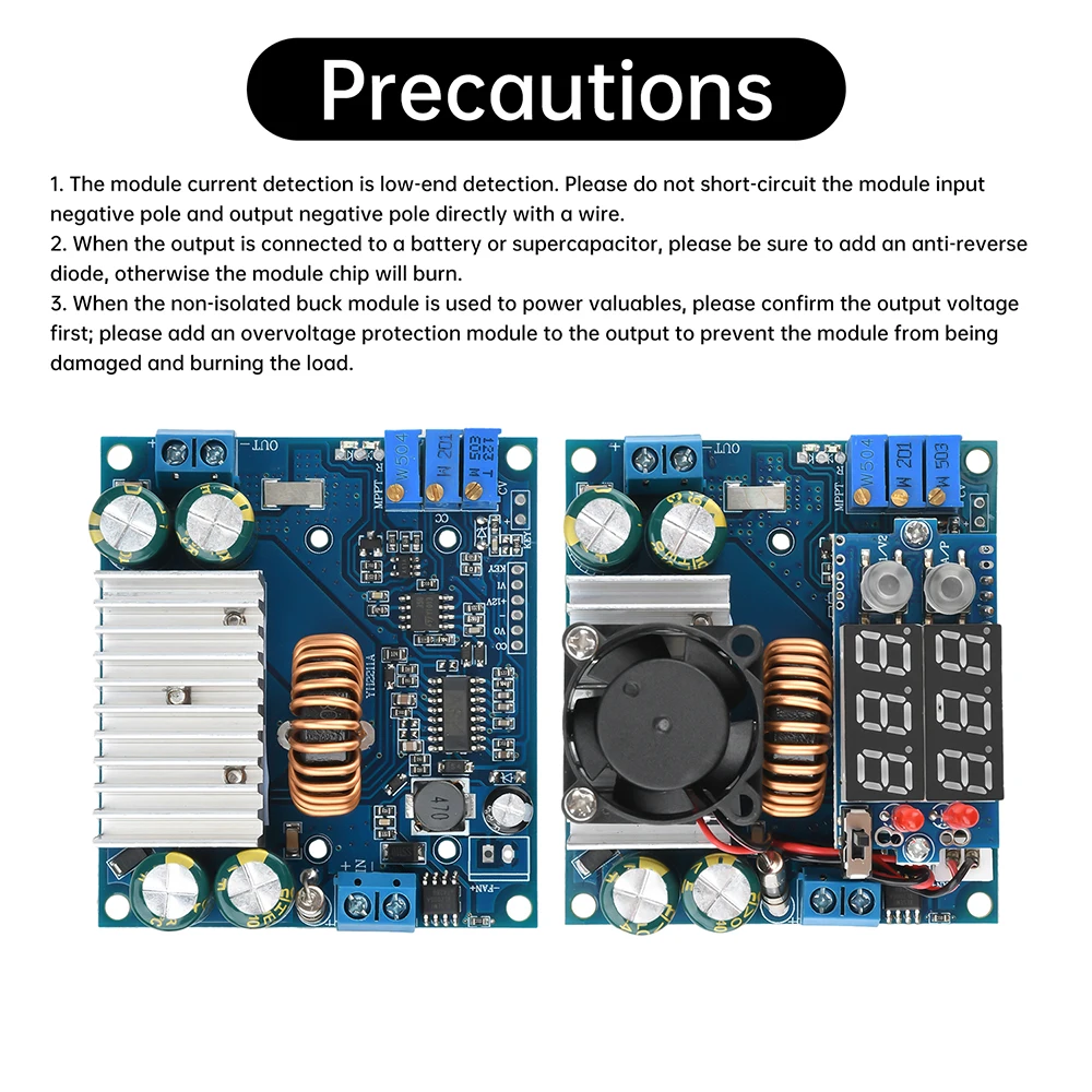 3.Cuando el módulo reductor no aislado suministre energía a los objetos de valor, verifique primero el voltaje de salida; agregue el módulo de protección contra sobretensión a la salida para evitar que el módulo dañe y queme la carga.