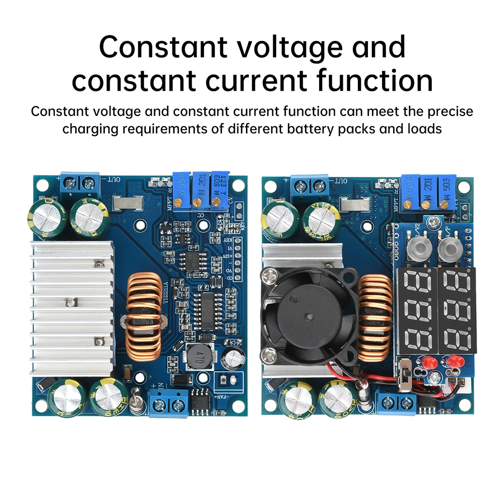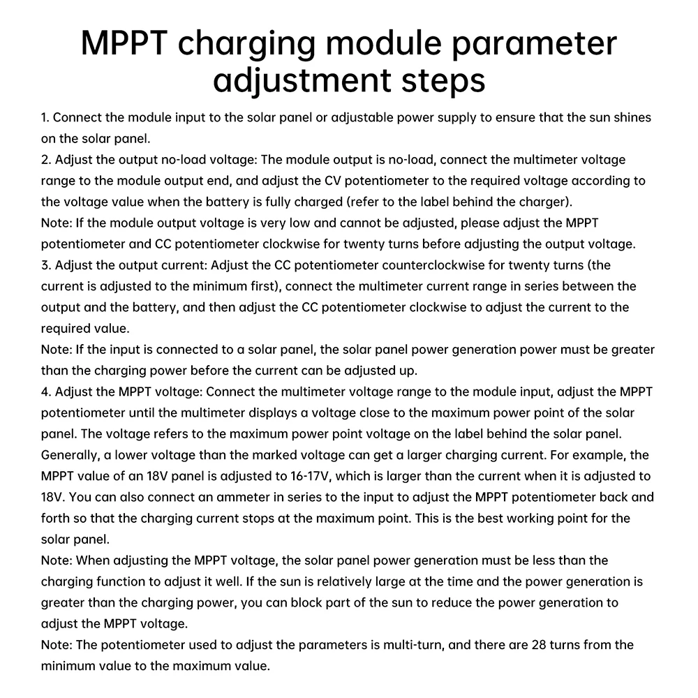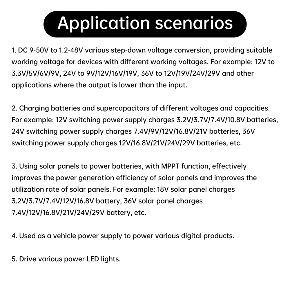 Rango ajustable de corriente de salida: 0,1-15 A MAX (se recomienda que el trabajo prolongado esté dentro de 10 A, fortalezca la disipación de calor si la temperatura es alta).Voltaje diferencial mínimo de entrada y salida: voltaje de entrada*0,1 (Cuanto mayor sea la corriente, mayor será el voltaje diferencial).Rango de configuración de voltaje MPPT: 9-50 V (la función MPPT se puede utilizar como protección contra subtensión de entrada)
