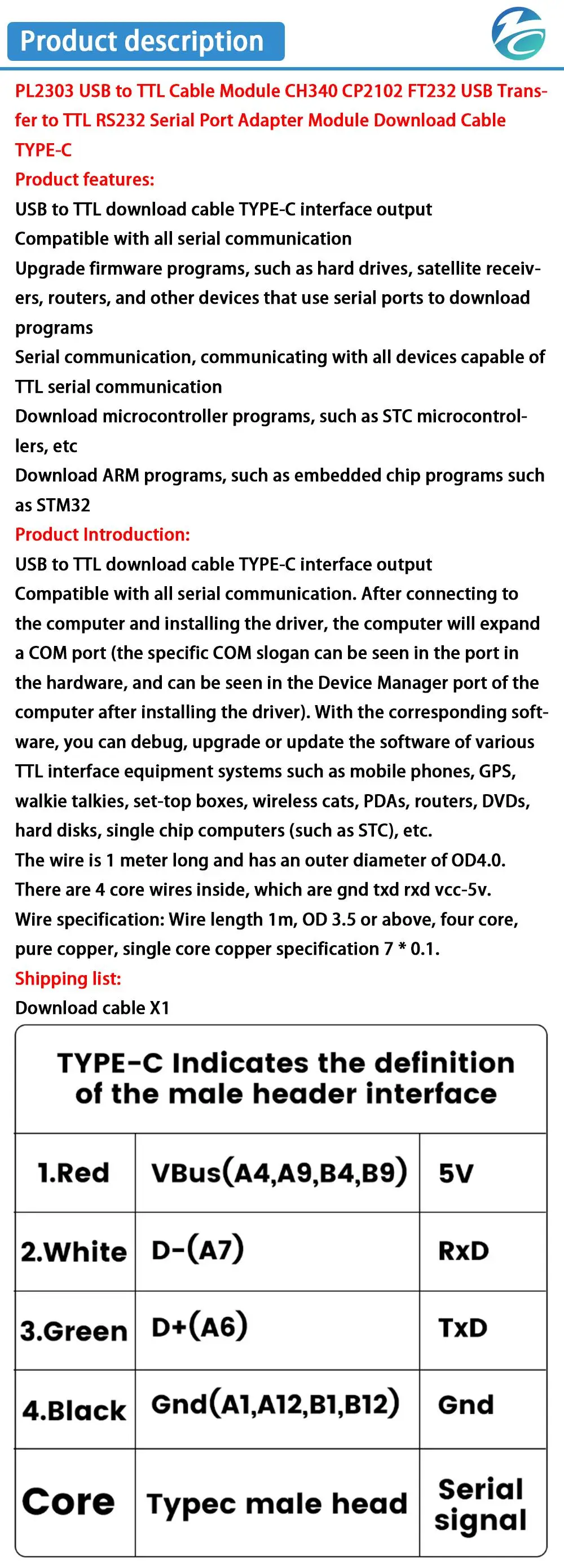 Cable de descarga USB a TTL Salida de interfaz TYPE-C