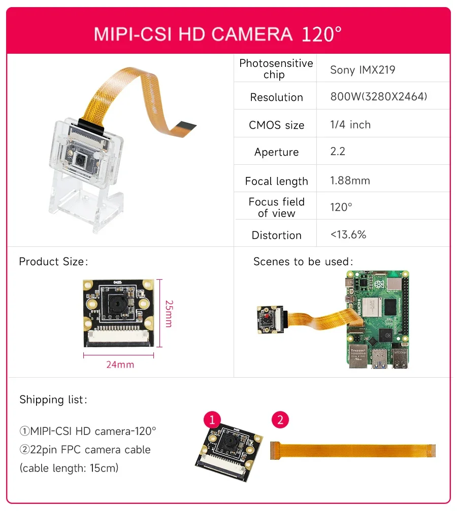 Usando chip Sony IMX219, 8MP, 77°/120°/160° disponible.