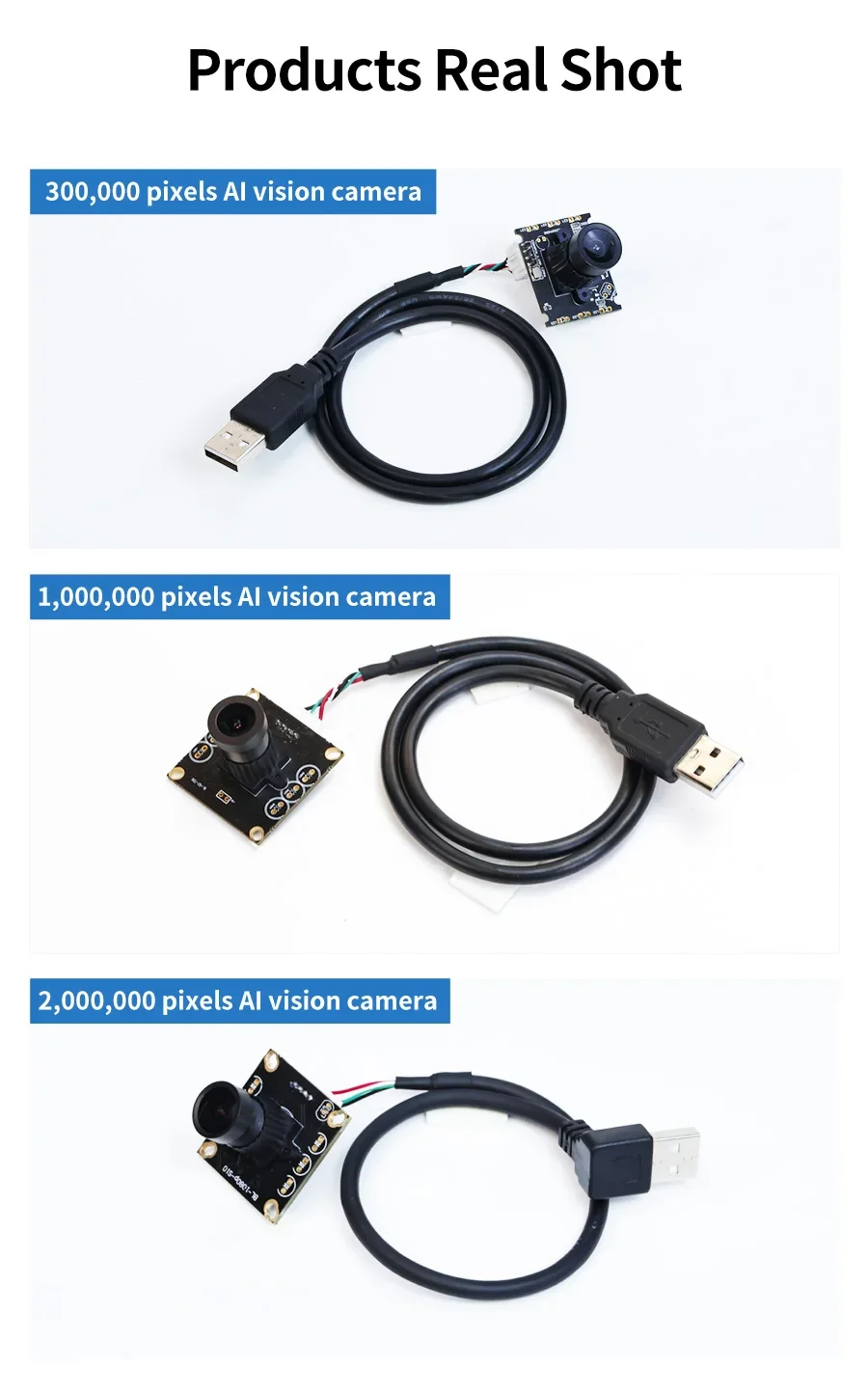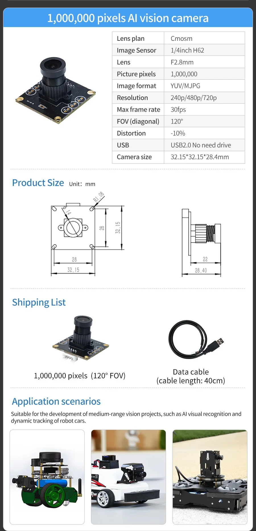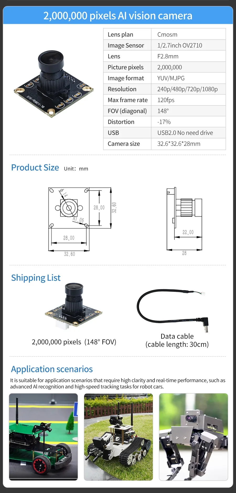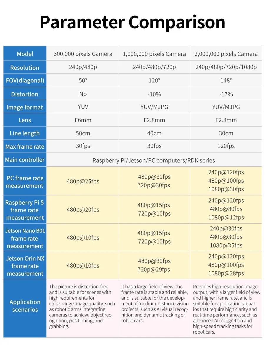 Utilizando un sensor de imagen OV2710 de 1/2,7 pulgadas y una lente F2.8MM, el FOV diagonal puede alcanzar hasta 148 ° , la velocidad máxima de fotogramas puede alcanzar los 120 fps. La imagen tiene una gran distorsión, es adecuada para escenarios de aplicación que requieren una alta claridad de imagen, como el reconocimiento avanzado de IA para robots y proyectos de seguimiento de alta velocidad.