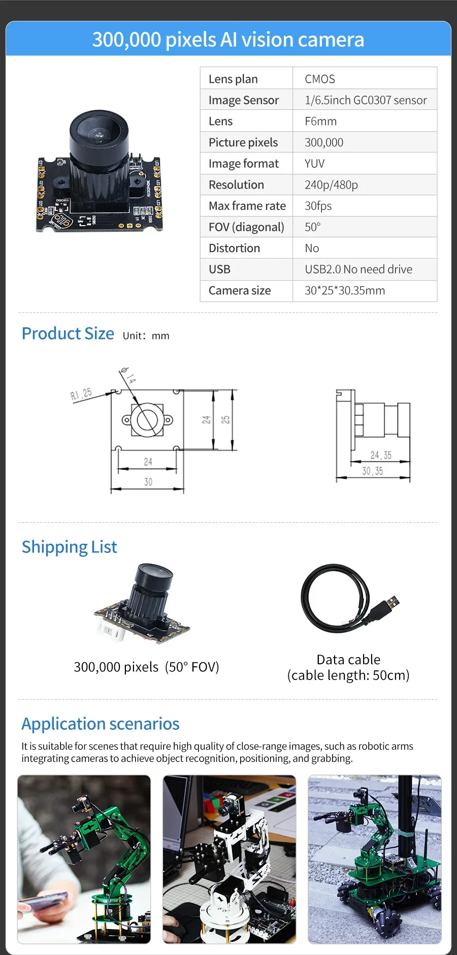 Utilizando un sensor de imagen GC0307 de 1/6,5 pulgadas y una lente F6MM, el FOV diagonal puede alcanzar hasta 50°, la velocidad máxima de fotogramas puede alcanzar los 30 fps.La imagen no tiene ninguna distorsión, es adecuada para escenas que requieren imágenes de alta calidad de corta distancia, como el seguimiento del color de los brazos robóticos, el agarre de objetos y otras funciones.
