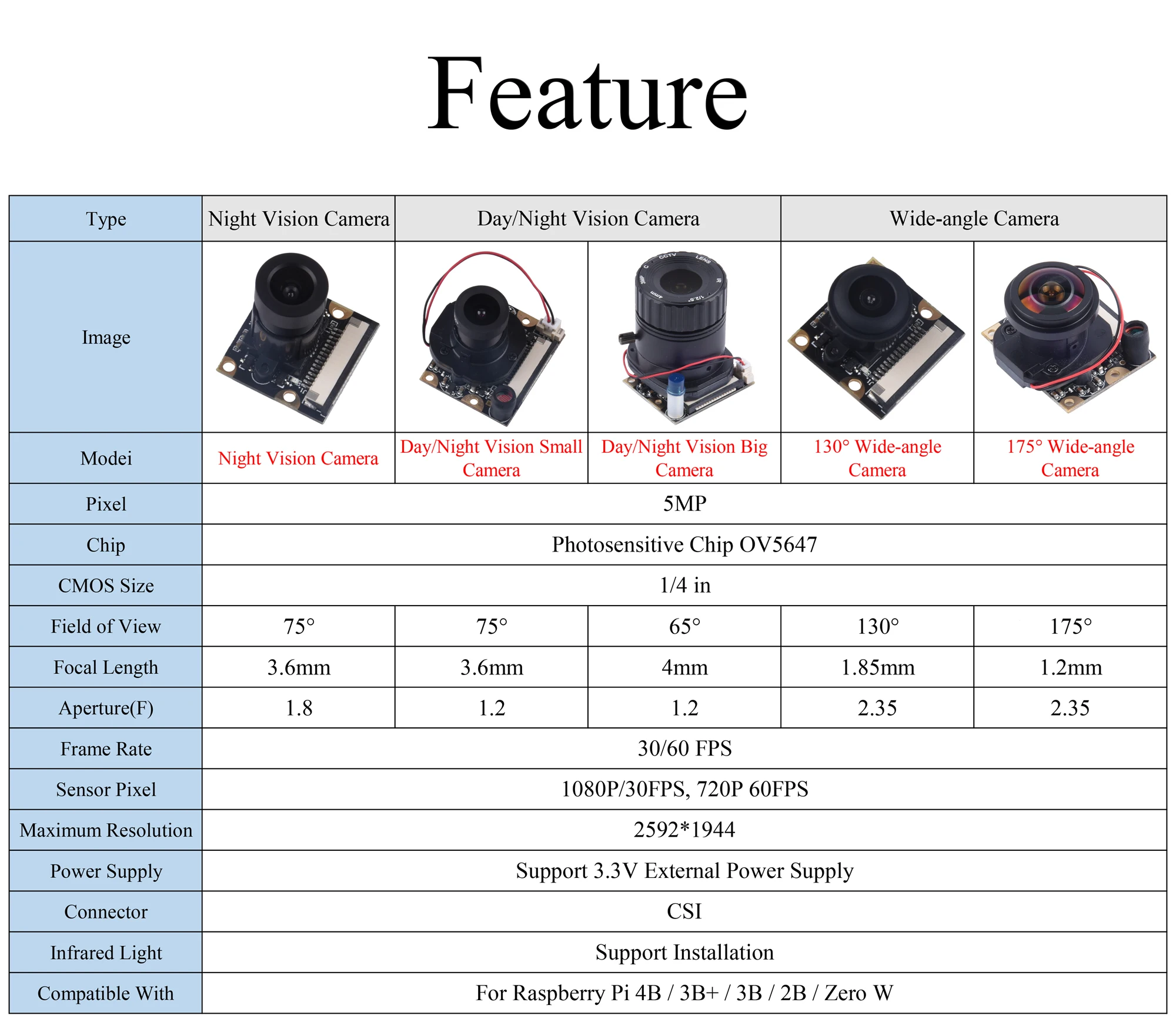 Comprar Módulo de cámara de visión diurna/nocturna Raspberry Pi 65 ° /75 ° /130 ° /175 ° Cámara web de 5MP con sensor de luz IR para Raspberry Pi 4B/3B+/3B Zero W