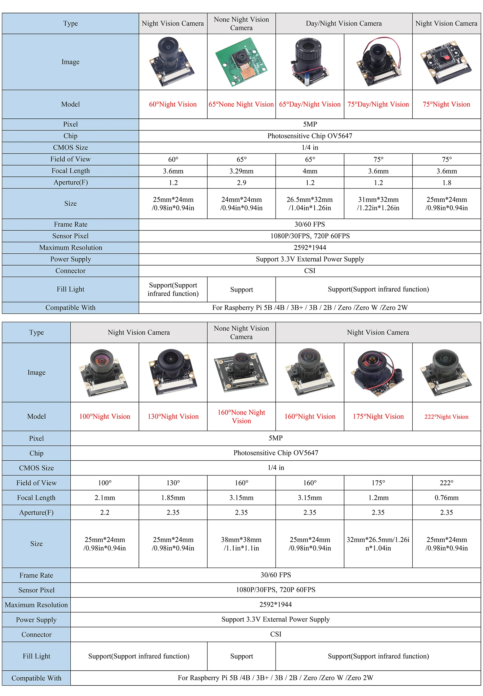The camera is compatible with Raspberry Pi 5B/4B/3B+/3B/2B/Zero W/Zero.