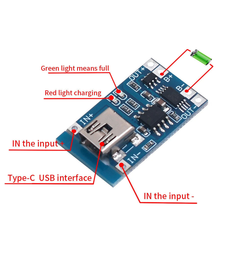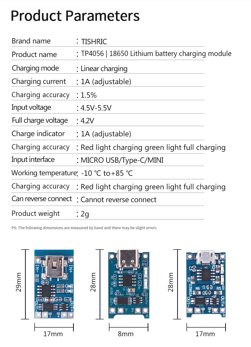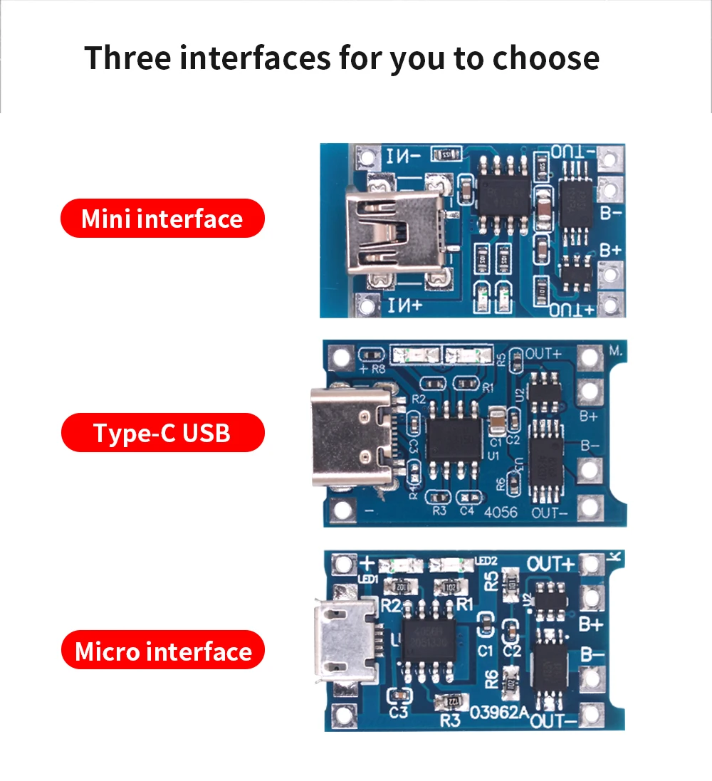5V 1A Micro/Tipo-c/Mini Placa de carga 18650 TP4056 Módulo de carga de batería de litio con protección Módulo de una placa 1A Li-ion