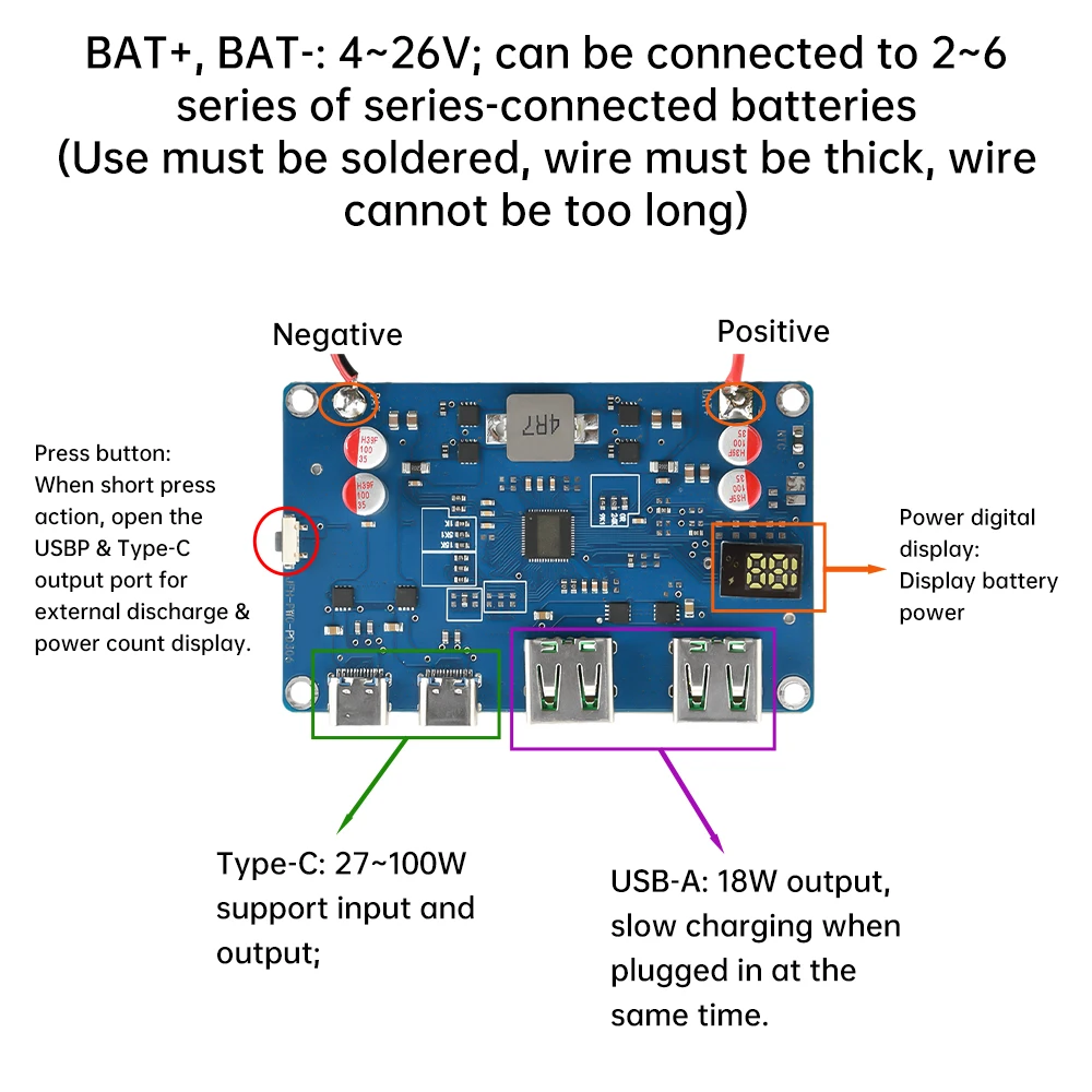 USB-A: Salida de 18W USB-A: Salida de 18W; se puede conectar a baterías serie 2-6S; Mientras tanto, conectar es una carga lenta