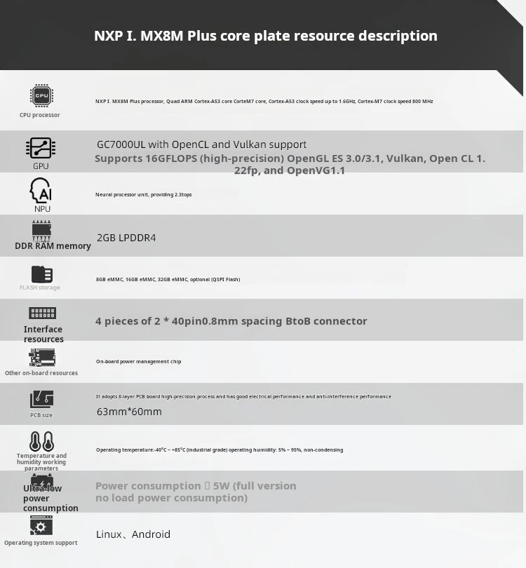 La placa cuenta con el sistema i.MX8M, que probablemente incluye unidades de procesamiento o interfaces adicionales para mejorar las capacidades de la placa.