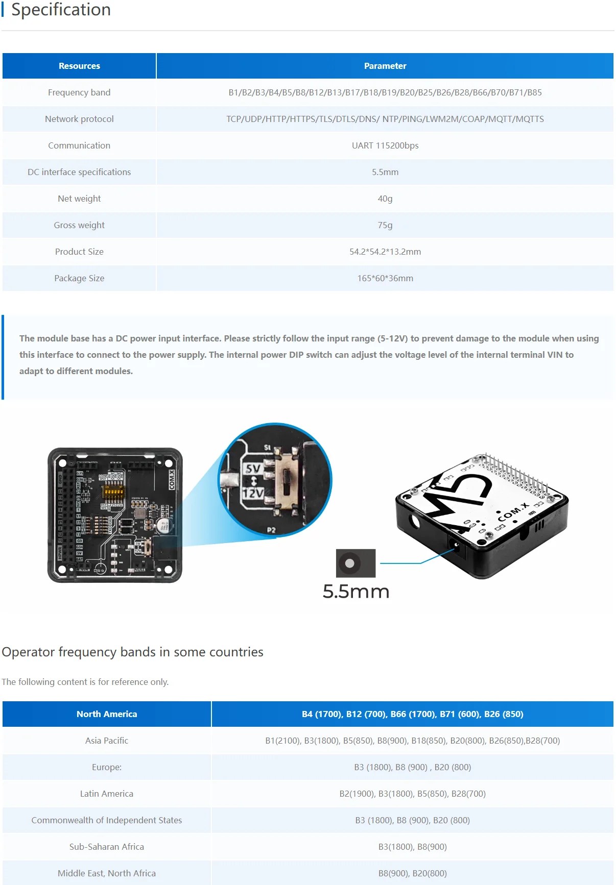 El módulo tiene una entrada de alimentación de CC y puede proporcionar una fuente de Alimentación de 5V-12V a través de una fuente de alimentación externa. Con el fin de facilitar al usuario la configuración del PIN, el interruptor DIP se utiliza para configurar el PIN. El módulo SIM7020G es la solución óptima para aplicaciones de baja latencia, bajo consumo de energía y bajo rendimiento. Es muy adecuado para aplicaciones IoT como medición, control remoto, seguimiento de activos, monitoreo remoto, telemedicina y uso compartido.