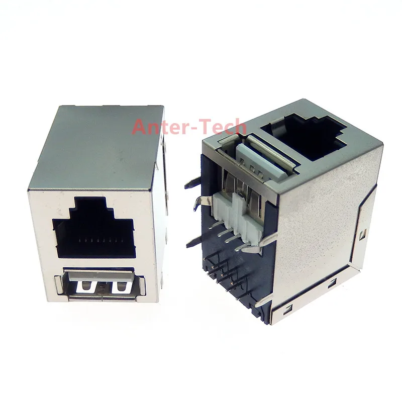 Módulo conector de red USB + RJ45 receptáculo Ethernet PCB Jack ángulo recto a través del agujero entrada lateral de la red