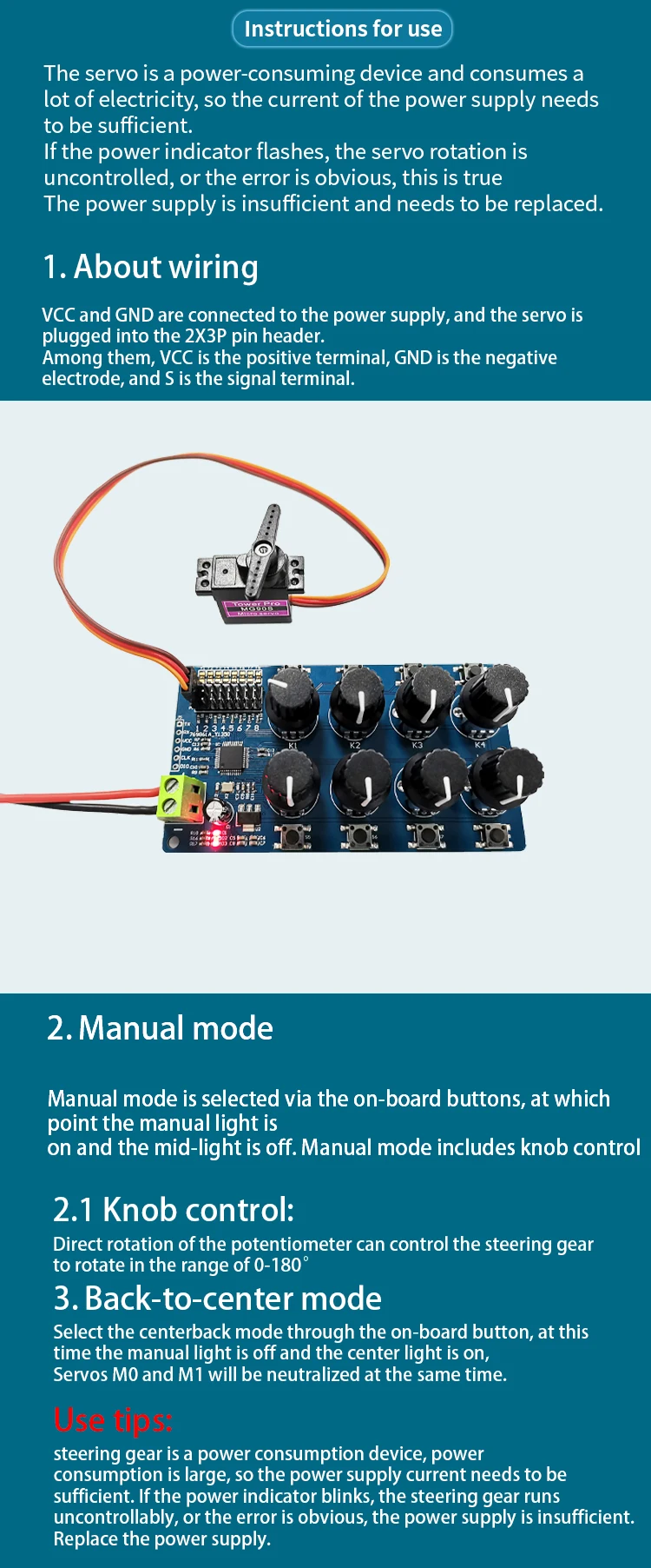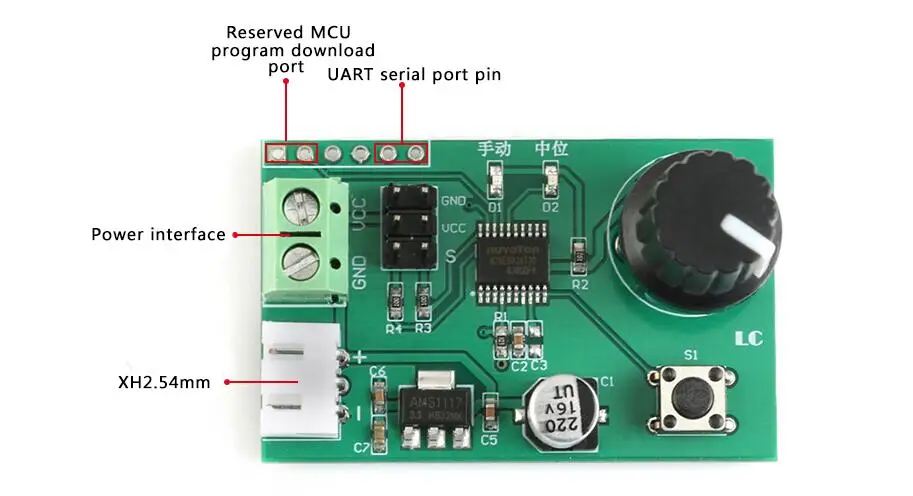 2.Modo manualEl modo manual se selecciona mediante el botón integrado, momento en que la luz manual está encendida y la luz central está apagada.El modo manual incluye control de perilla y control de puerto serie.El valor predeterminado es el control de la perilla.Los dos modos de control cambiarán automáticamente, es decir, cuando se detecte que el potenciómetro gire, se selecciona la perilla.Cuando el puerto serie recibe un comando de control válido, se selecciona el control del puerto serie.2.1 control de perilla:Gire el potenciómetro directamente para controlar que el mecanismo de dirección gire en el rango de 0-180°.
