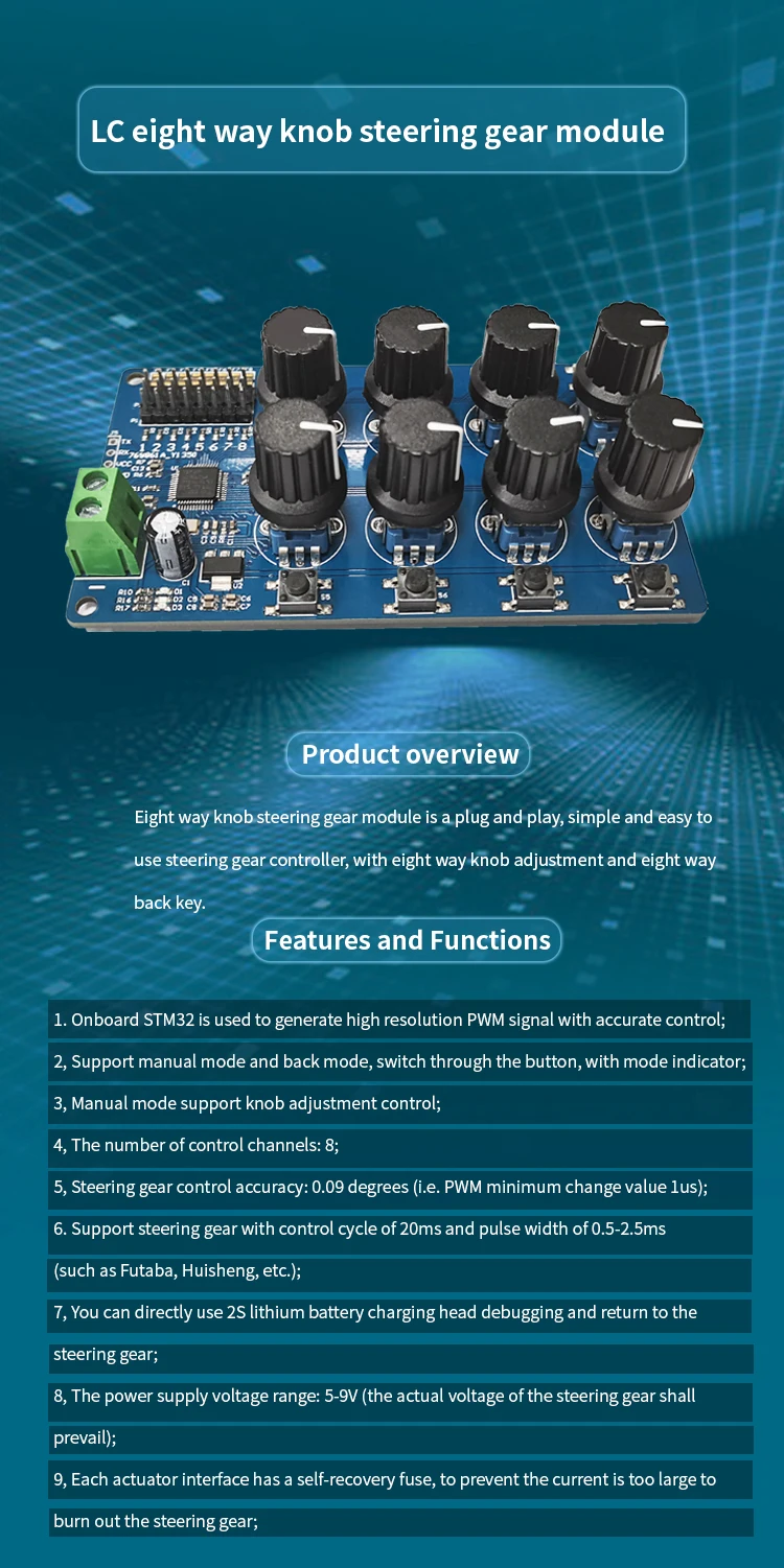 Número de canales de control: 2 canales (servos MO y M1).Cuando se utiliza la función de ajuste y retorno de la perilla, los 2 servos se controlan al mismo tiempo.Cuando se utiliza el comando serie, los 2 servos se pueden controlar por separado.