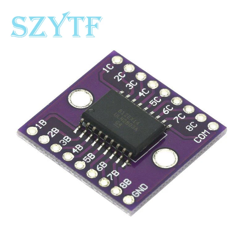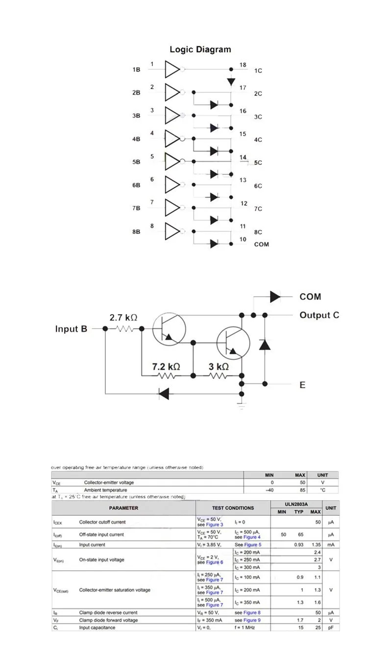 ULN2803A consta de 8 tubos NPN Darlington con diodos de sujeción incorporados para cargas inductivas.Se pueden conectar varios Darlingtons en paralelo para controlar cargas de alta corriente.El dispositivo ULN2803A es un conjunto de transistores Darlington de 50 V y 500 mA.El dispositivo consta de ocho pares de NPN Darlington con salida de alto voltaje y diodos de abrazadera de cátodo común para conmutar cargas inductivas.Cada par Darlington tiene una corriente nominal de colector de 500 mA.Los pares Darlington se pueden conectar en paralelo para aumentar la capacidad actual.Las aplicaciones incluyen controladores de relé, controladores de martillo, controladores de lámpara, controladores de pantalla (LED y descarga de gas), controladores de línea y amortiguadores lógicos.Cada par darlington de dispositivos ULN2803A tiene una resistencia base de la serie W de 2,7K y puede funcionar directamente con dispositivos TTL o CMOS de 5V.