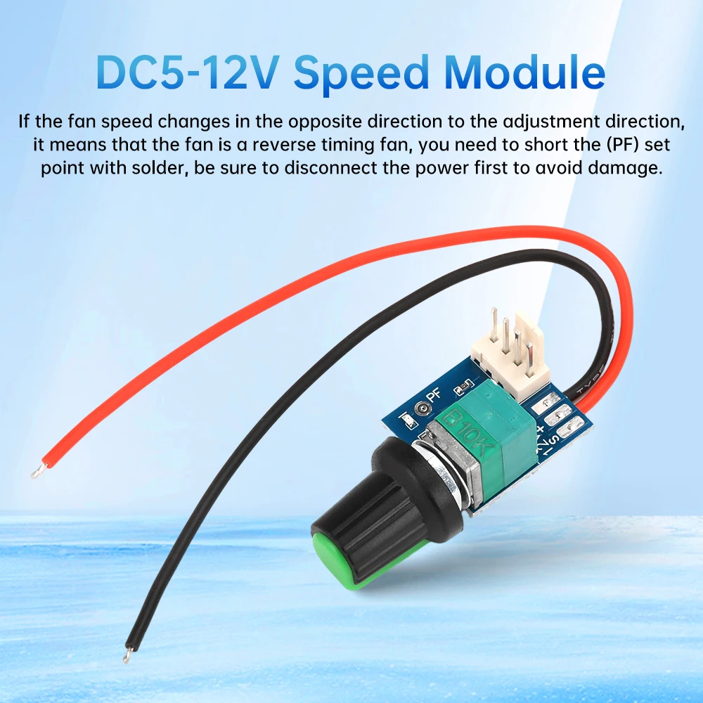 Preste atención a los polos positivo y negativo y al voltaje de la fuente de alimentación, conecte el ventilador de la fuente de alimentación que se puede usar, el potenciómetro en sentido antihorario hasta el final del cierre, en el sentido de las agujas del reloj hasta el final de la salida máxima.