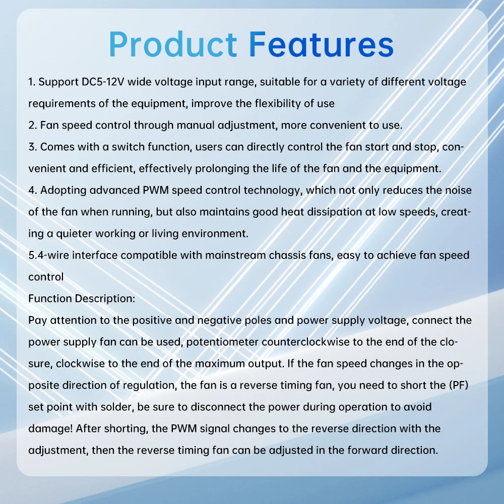 Este es un regulador de velocidad del ventilador PWM de cuatro cables, solo puede controlar el ventilador de cuatro cables que admite la regulación de velocidad PWM, como muchos chasis de cuatro cables de 12 V o ventiladores de CPU, ¡no puede controlar un ventilador de 2-3 cables!!!