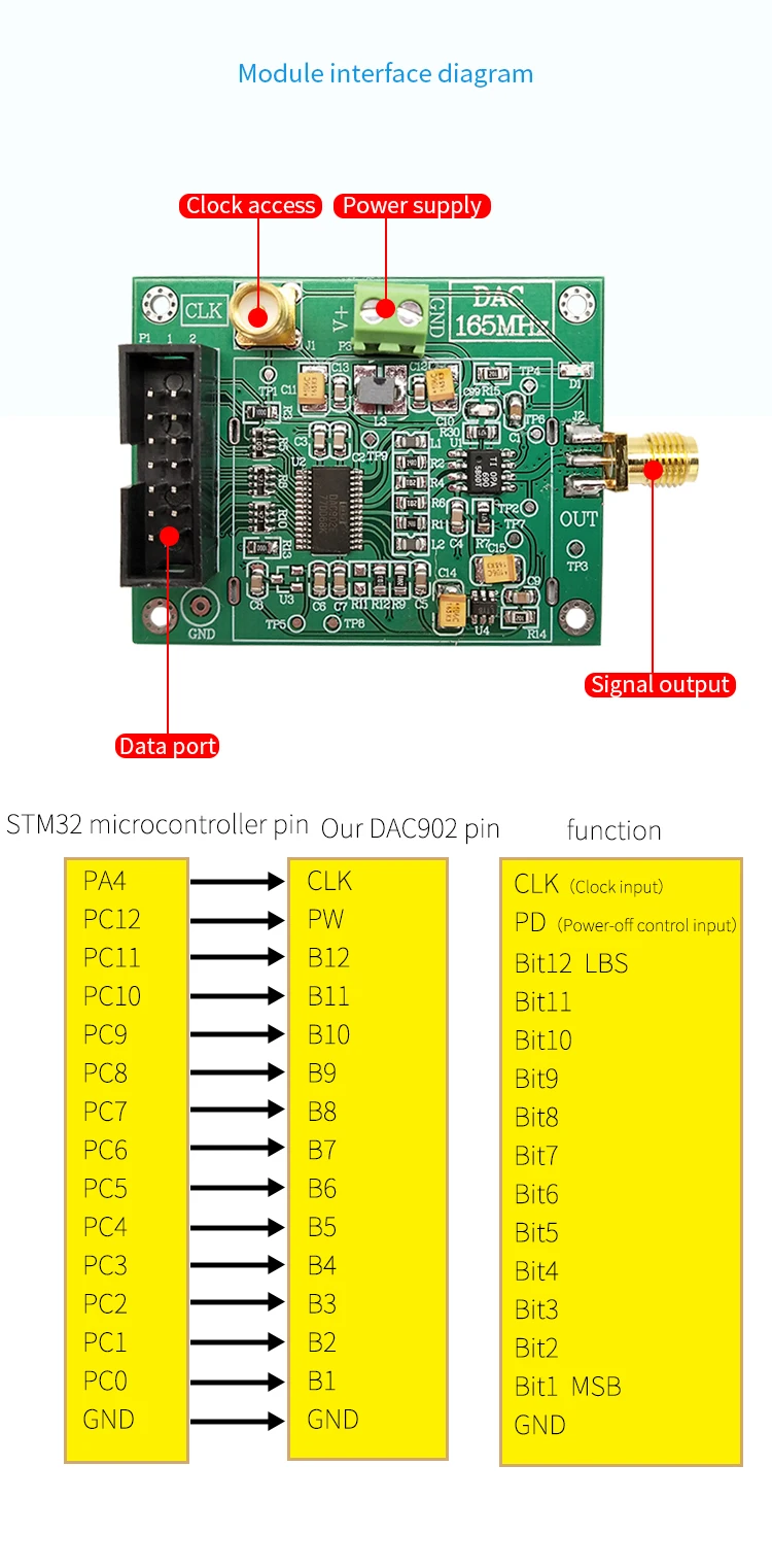 Preguntas frecuentes:P: ¿Cuál es la frecuencia más alta que el DAC902 puede generar una onda sinusoidal con la placa de control principal de nuestra tienda?R: La frecuencia de salida predeterminada del tablero de control principal de nuestra tienda es 1KHz. Dado que el microordenador de un solo chip no puede lograr el mejor rendimiento de DAC902, no hay un valor límite de prueba; en general, se requiere un procesador de alta velocidad como FPGA para ejercer todo su rendimiento; el máximo teórico es la onda sinusoidal de 33MHz.P: ¿Se puede aumentar el rango de voltaje de salida del módulo? ¿Cuál es la precisión del control? ¿Cuál debe ser la capacidad de corriente de salida?R: En la actualidad, el circuito del módulo solo puede emitir ± 1,25 V, y la precisión del control del voltaje de salida es de 1mV (ondulación de baja potencia). La salida de corriente está dentro de 50mA, y el aumento se puede modificar de acuerdo con el diagrama esquemático para aumentar el voltaje de salida, pero la precisión del control también disminuirá.P: ¿Cuál es la diferencia entre el reloj en el puerto SMA en la placa y el reloj en el encabezado del PIN?R: No hay diferencia. El Puerto SMA tiene un mejor efecto de protección y es más resistente a las interferencias.