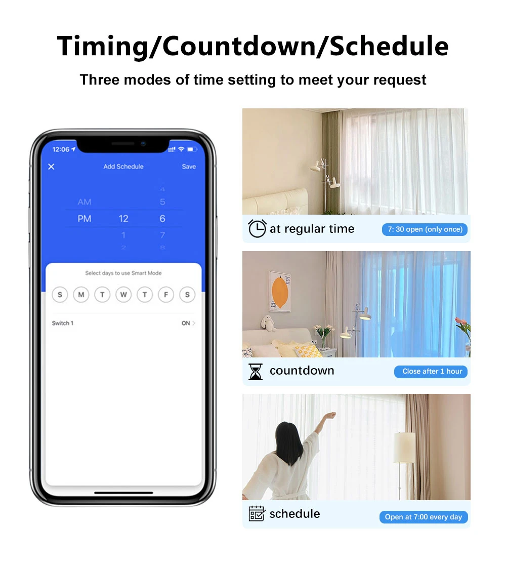 Puede establecer un horario para el módulo de conmutación según sus necesidades individuales.Disfrute de la cómoda vida inteligente sin repetir el encendido y apagado de la aplicación ni controlar manualmente.