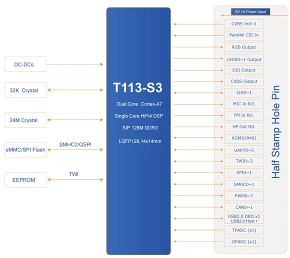 ElUtiliza un procesador Allwinner T113-S3 de 14 mm, paquete eLQFP128 diseñado para productos de control industrial y automotriz.Integra CPU Cortex-A7 de doble núcleo y DSP HiFi4 de un solo núcleo para proporcionar una potencia informática de alta eficiencia.T113-S3 admite decodificación de formato completo como H.265, H.264, MPEG-1/2/4, JPEG, VC1, etc.El codificador de hardware independiente puede codificar en JPEG o MJPEG.Los múltiples ADC/DAC integrados y las interfaces de audio I2S/PCM/DMIC/OWA pueden proporcionar la solución de interacción de voz perfecta.T113-S3 viene con amplia conectividad para facilitar la expansión del producto, como CAN, USB, SDIO, EMAC, TWI, UART, SPI, PWM, GPADC, IR TX y RX, etc.